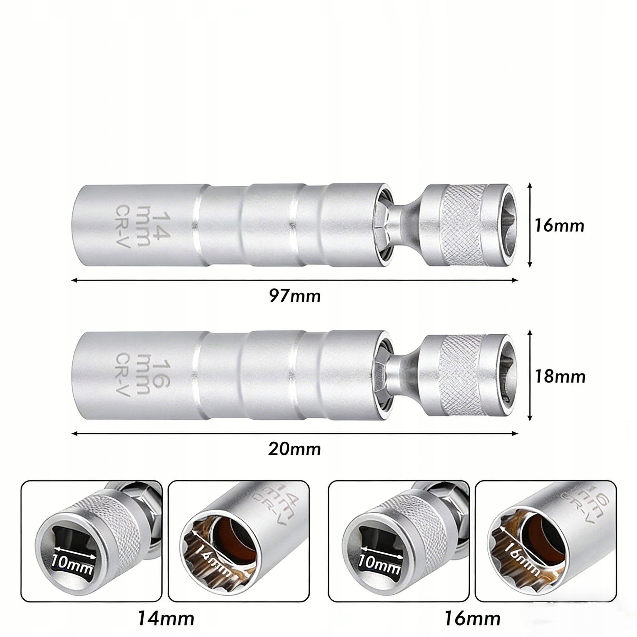 Zestaw zawiera nasadkę 3/8 cala oraz magnetyczne, obracające się gniazda do świec zapłonowych o rozmiarach 14 mm i 16 mm, wyposażone w konstrukcję 12-punktową. Unikalny projekt z wypustkami zwiększa tarcie i pewność chwytu, co ułatwia precyzyjne montowanie i demontowanie świec zapłonowych.