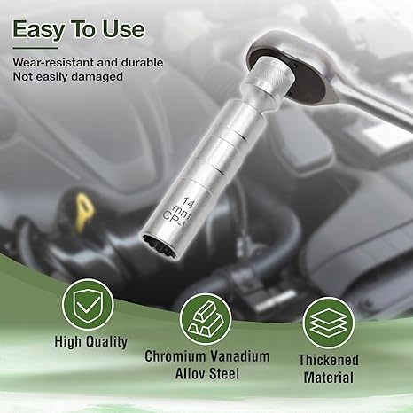 Obrotowa głowica zapewnia pewne trzymanie w grzechotce, a silny magnes w górnej części bezpiecznie utrzymuje świecę zapłonową. Dzięki temu podczas montażu i demontażu masz pewność, że świeca pozostanie na swoim miejscu, eliminując ryzyko jej upuszczenia lub zgubienia.