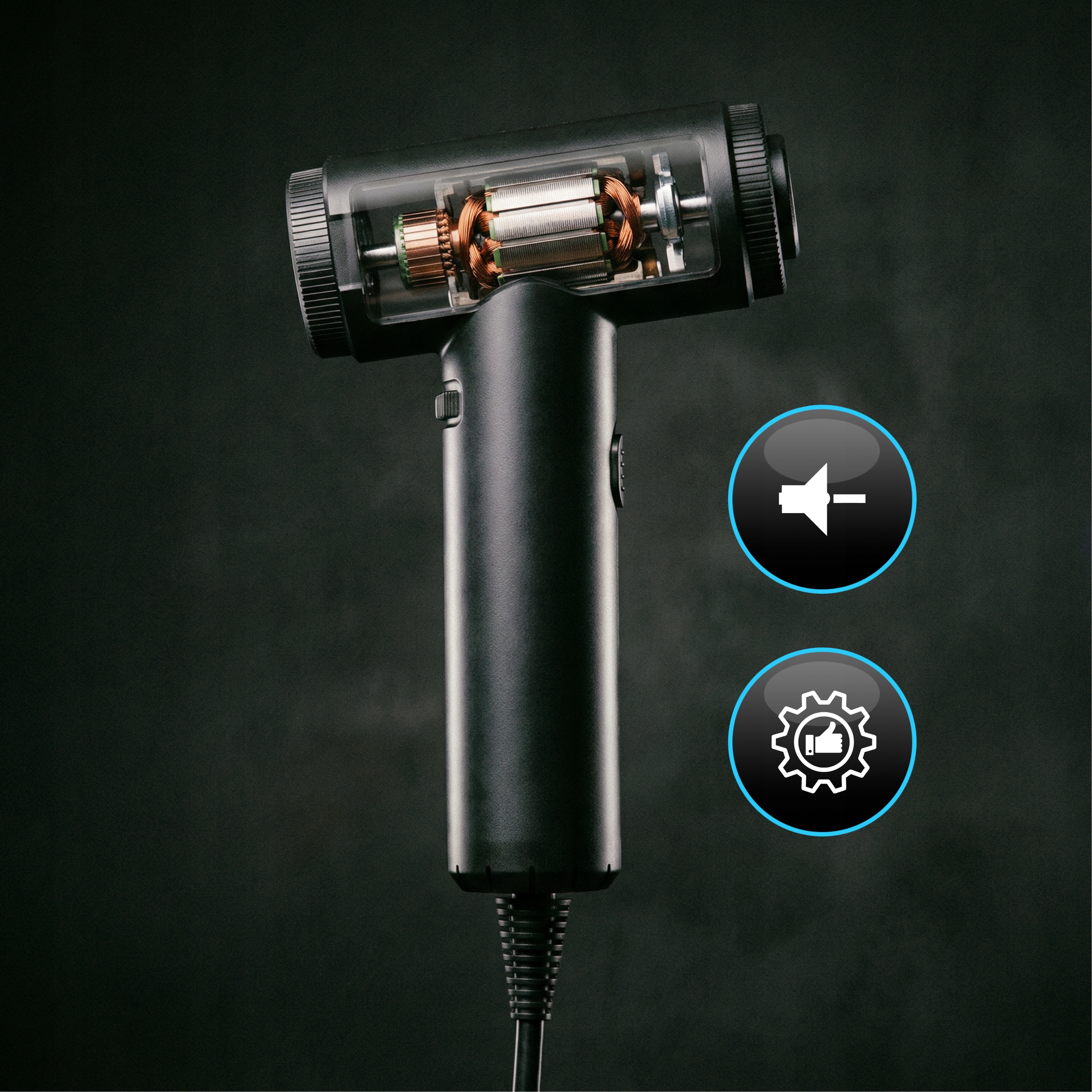 ✔️Maksymalna wydajność 105 000 RPM – silnik bezszczotkowy pozwala na osiągnięcie ogromnych obrotów przy zachowaniu pełnej stabilności. Strumień powietrza jest zawsze tak samo mocny, od pierwszej do ostatniej sekundy pracy.