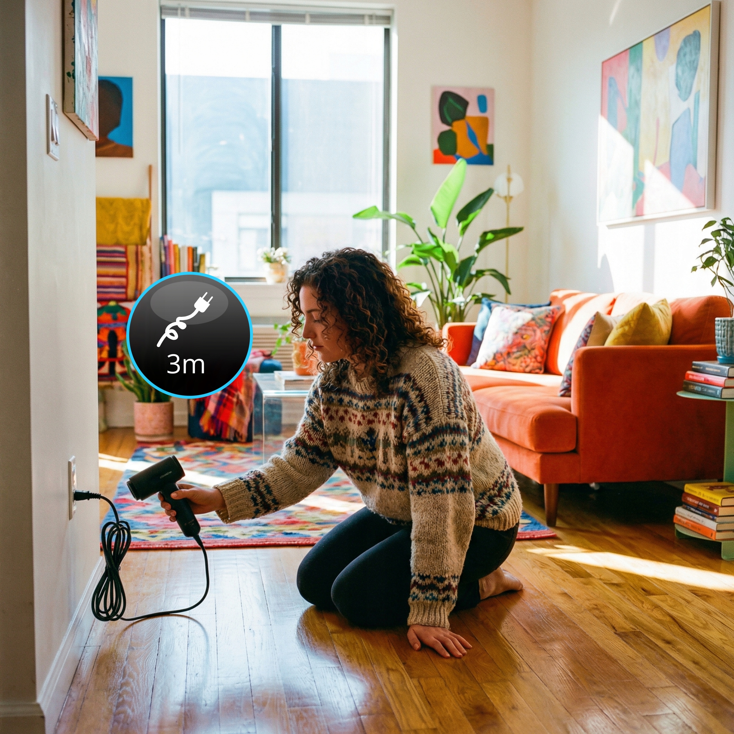 ✔️ Kabel o długości 3 metrów – wyjątkowo długi przewód zasilający zapewnia ogromny zasięg. Swobodnie wyczyścisz całe biurko, wnętrze szafy czy wysokie regały bez użycia przedłużacza.