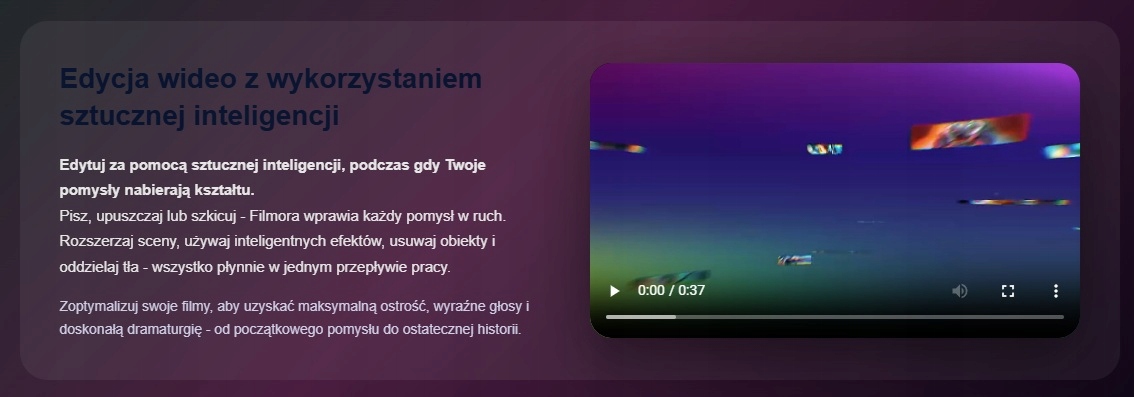 Zakup Wondershare Filmora 15 oznacza inwestycję w nową generację edycji wideo. Dzięki zintegrowanej sztucznej inteligencji, tła mogą być oddzielane, obiekty usuwane, a filmy optymalizowane pod kątem maksymalnej ostrości i jakości wizualnej. Inteligentne efekty udoskonalają każdą scenę, podczas gdy proces twórczy pozostaje płynny - od początkowego pomysłu do ostatecznego eksportu.