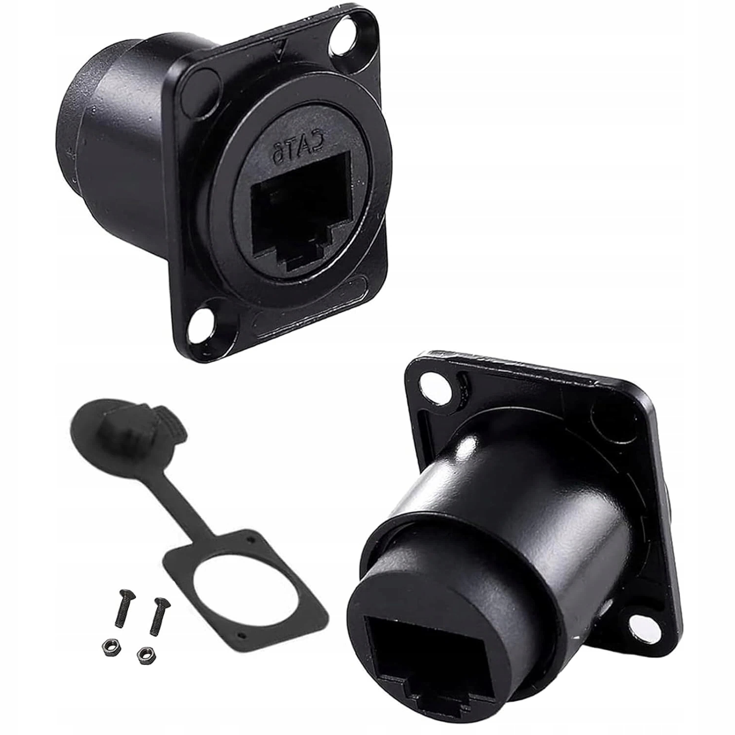 2x adapter panelowy RJ45 CAT6, 2x osłonę przeciw wodzie/pyłowi, 4לrubę i 4×nakrętkę.