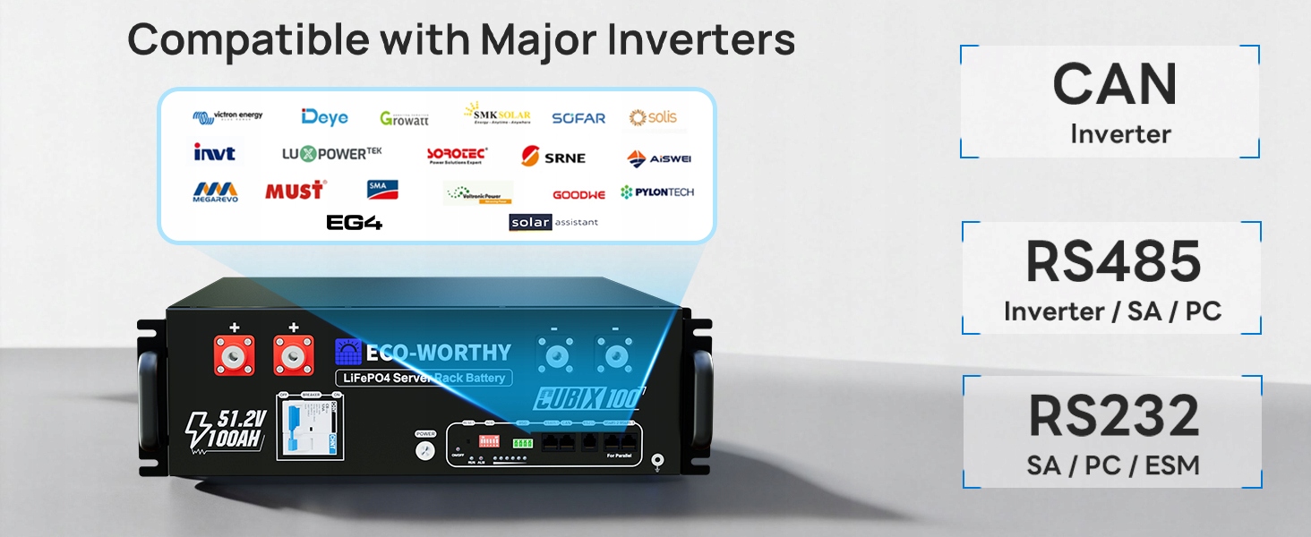 Bateria z komunikacją w zamkniętej pętli: Akumulator serwerowy 48V (51,2V) posiada wbudowane interfejsy CAN/RS485 oraz obsługuje różne protokoły komunikacyjne, co umożliwia współpracę z popularnymi falownikami solarnymi. Dzięki temu system działa inteligentniej. Wbudowany Bluetooth i WiFi pozwalają na łatwe monitorowanie stanu baterii za pomocą aplikacji mobilnej.
