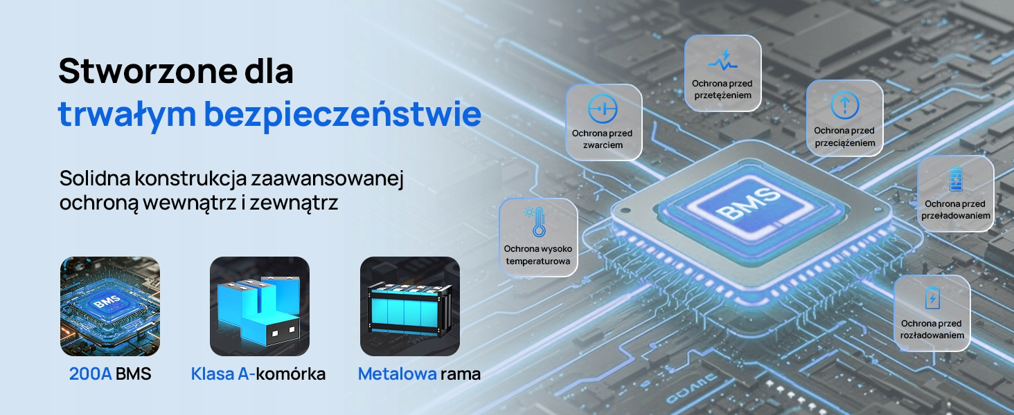BMS z ochroną przed niską temperatureą:LiFePO4 280 Ah Bluetooth z ochroną przed niską temperatureą BMS, która przerywa proces ładowania i zapobiega uszkodzeniom akumulatora LiFePO4, gdy temperatura ładowania wynosi poniżej 0°C. Akumulator LiFePO4 280 Ah z nad- lub niski napięciem, przetężeniem, wysoką temperaturesą lub zwarciem.