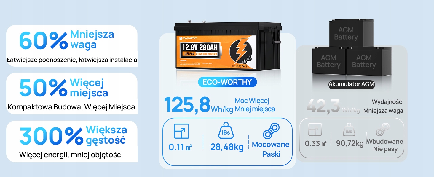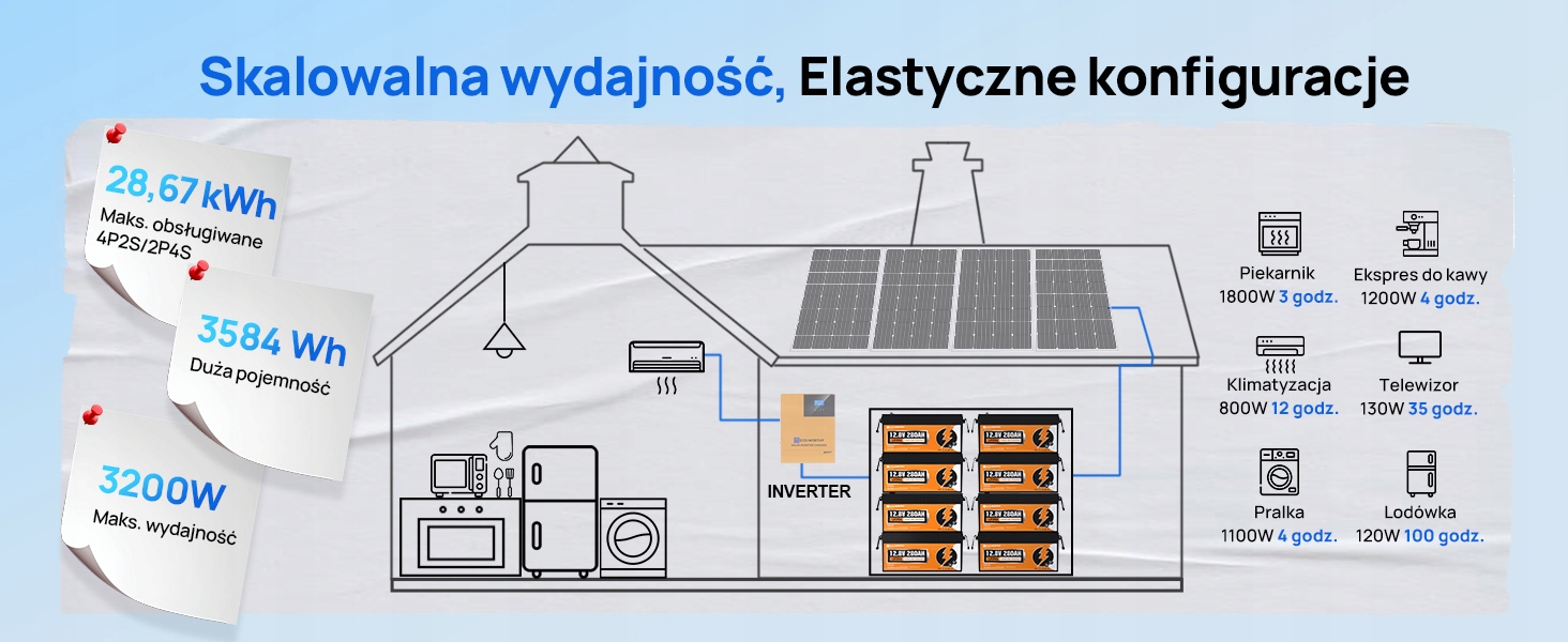 Szerokie zastosowanie: Bluetooth LiFePO4 12 V 280 Ah można łączyć nie tylko równolegle, ale również szeregowo. W przypadku połączenia szeregowego można podłączyć do 4 identycznych baterii. LiFePo4 280 Ah do przyczep kempingowych, statków, wózków golfowych, instalacji solarnych lub może być używany jako awaryjne źródło zasilania.