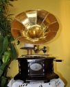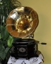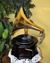 złotą tubą. Patefon wyposażony w ręcznie nakręcany mechanizm