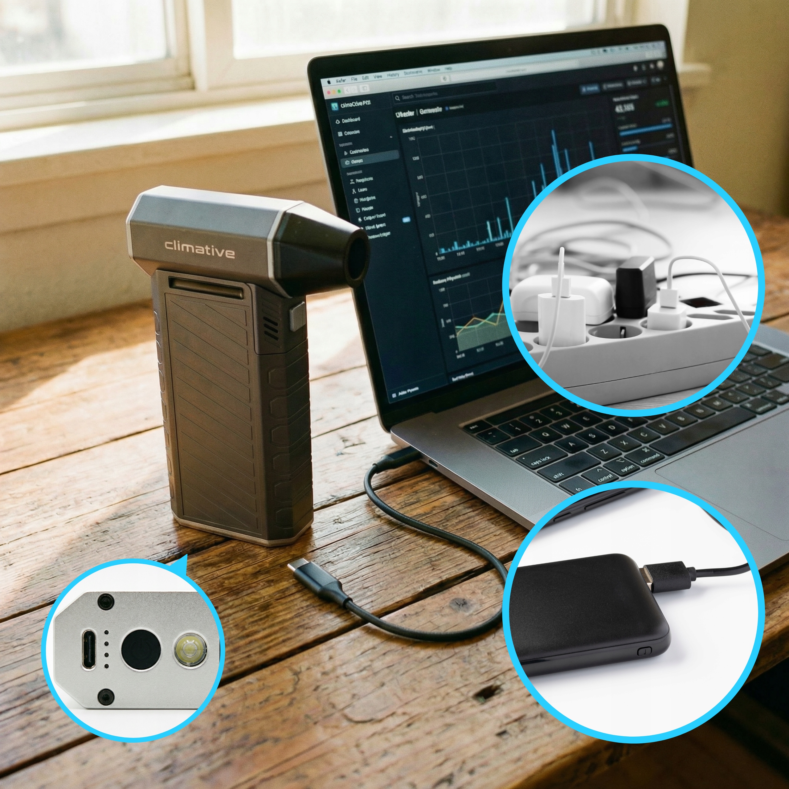 ☑️ Ładowanie 3-strefowe – podłącz dmuchawę do laptopa podczas pracy, do powerbanku w podróży lub do tradycyjnej ładowarki sieciowej w domu.