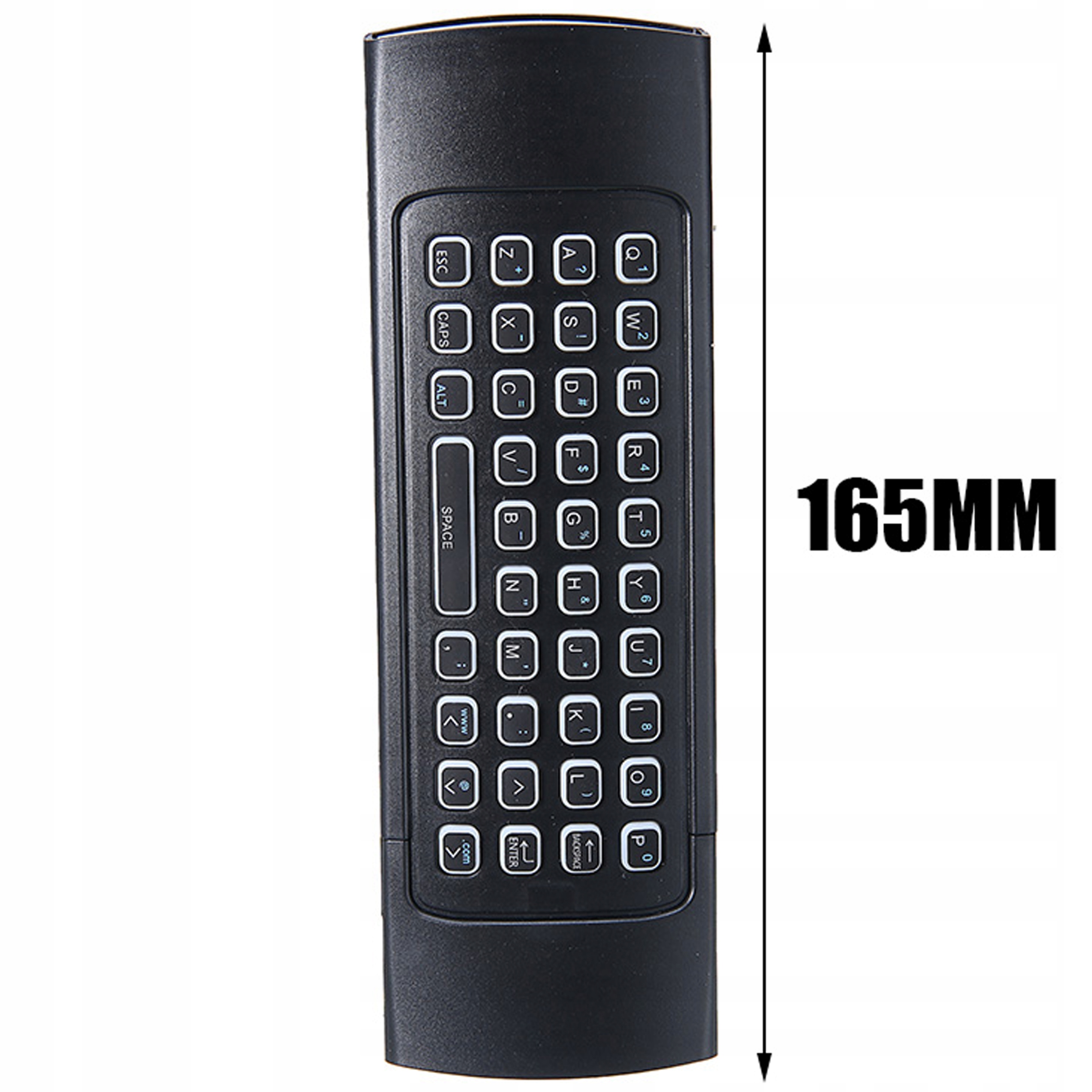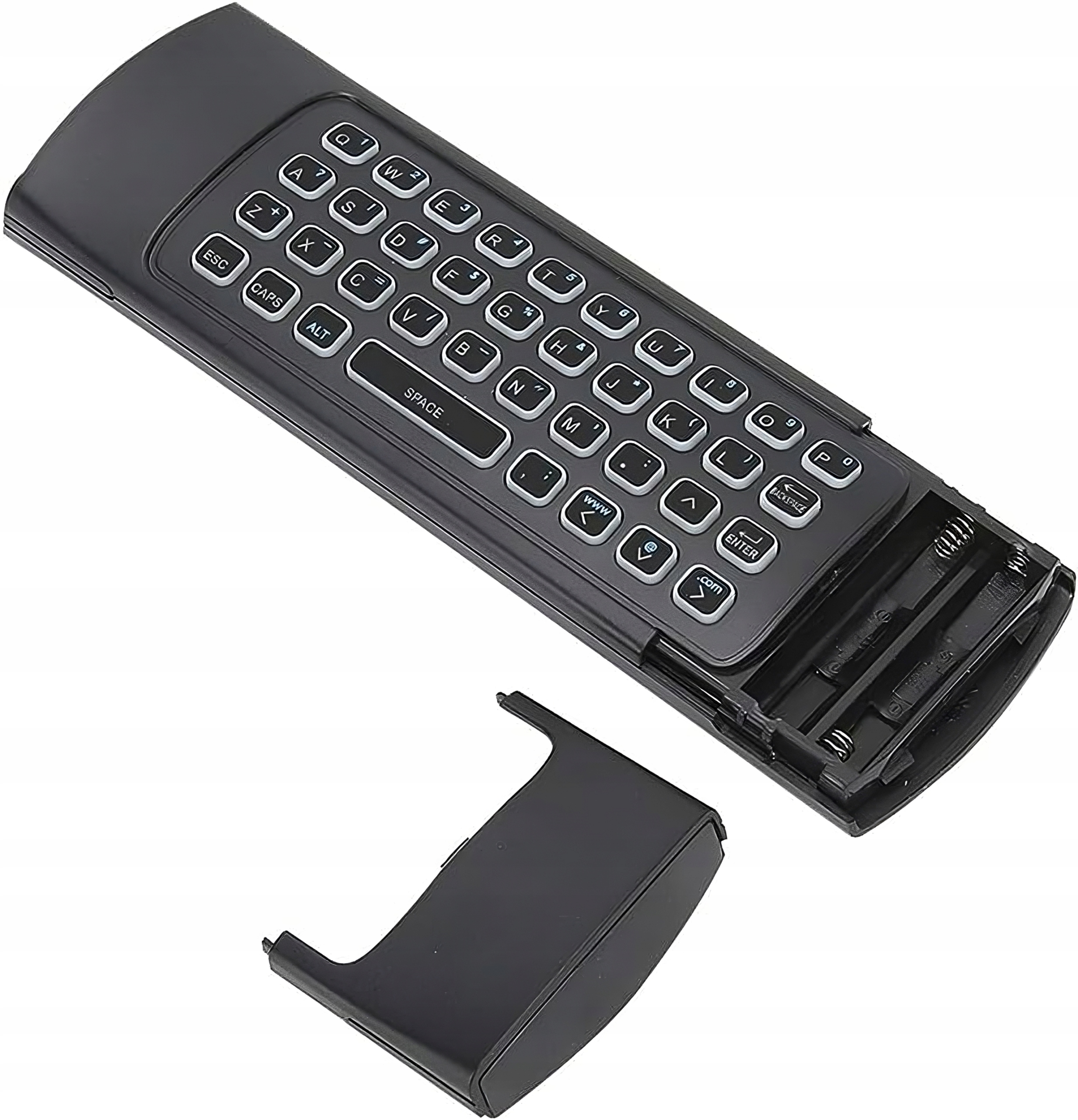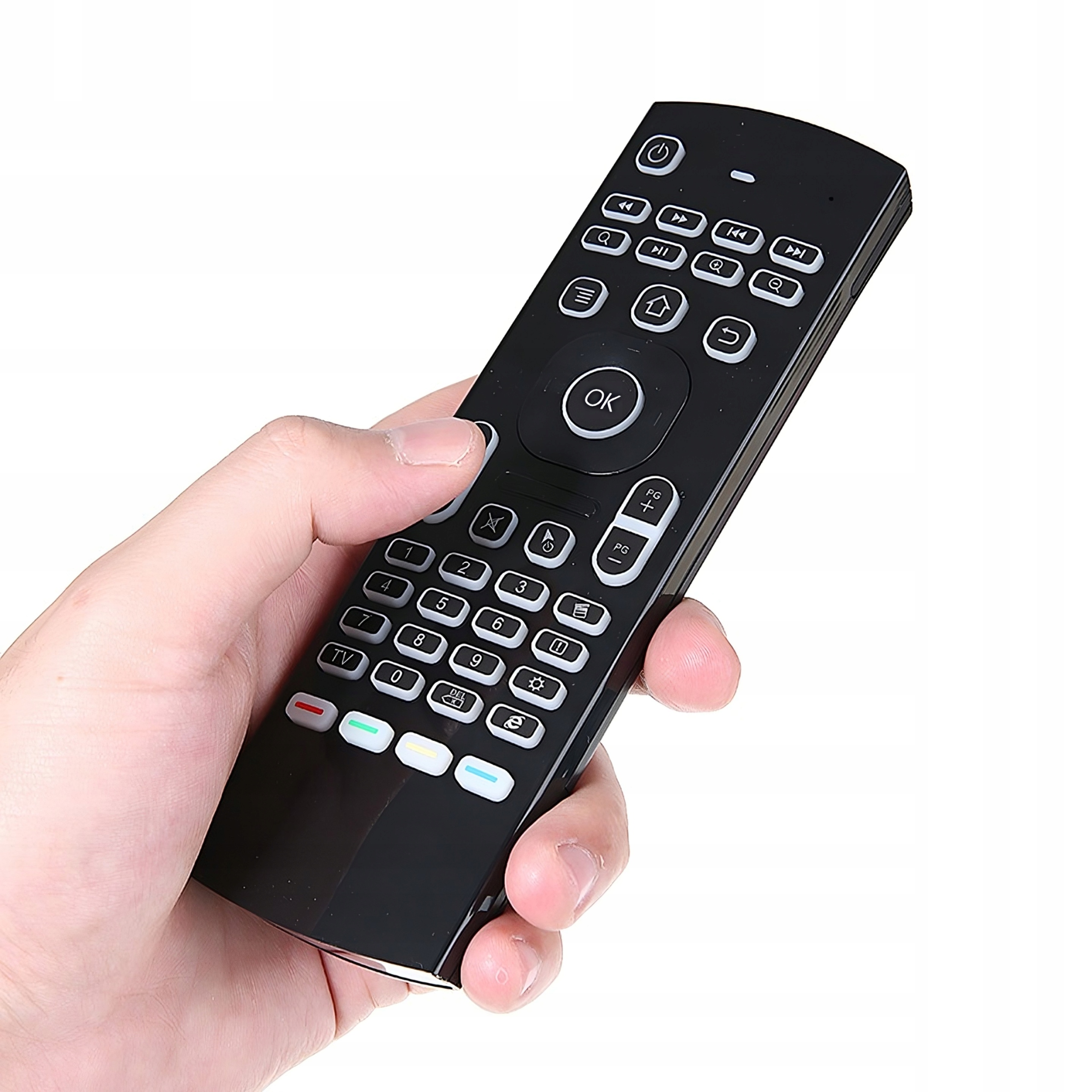 Uniwersalny pilot, posiada wbudowaną i bardzo wygodną klawiaturę ze wszystkimi przyciskami QWERTY. Koniec uciążliwego wpisywania tytułów i nazw stron www! Dodatkowo posiada funkcję myszki i w prosty sposób pozwala skopiować przyciski z pilotów. Zasila go wbudowany akumulator, a łączy się z urządzeniami przez odbiornik USB albo IR, jak klasyczny pilot.