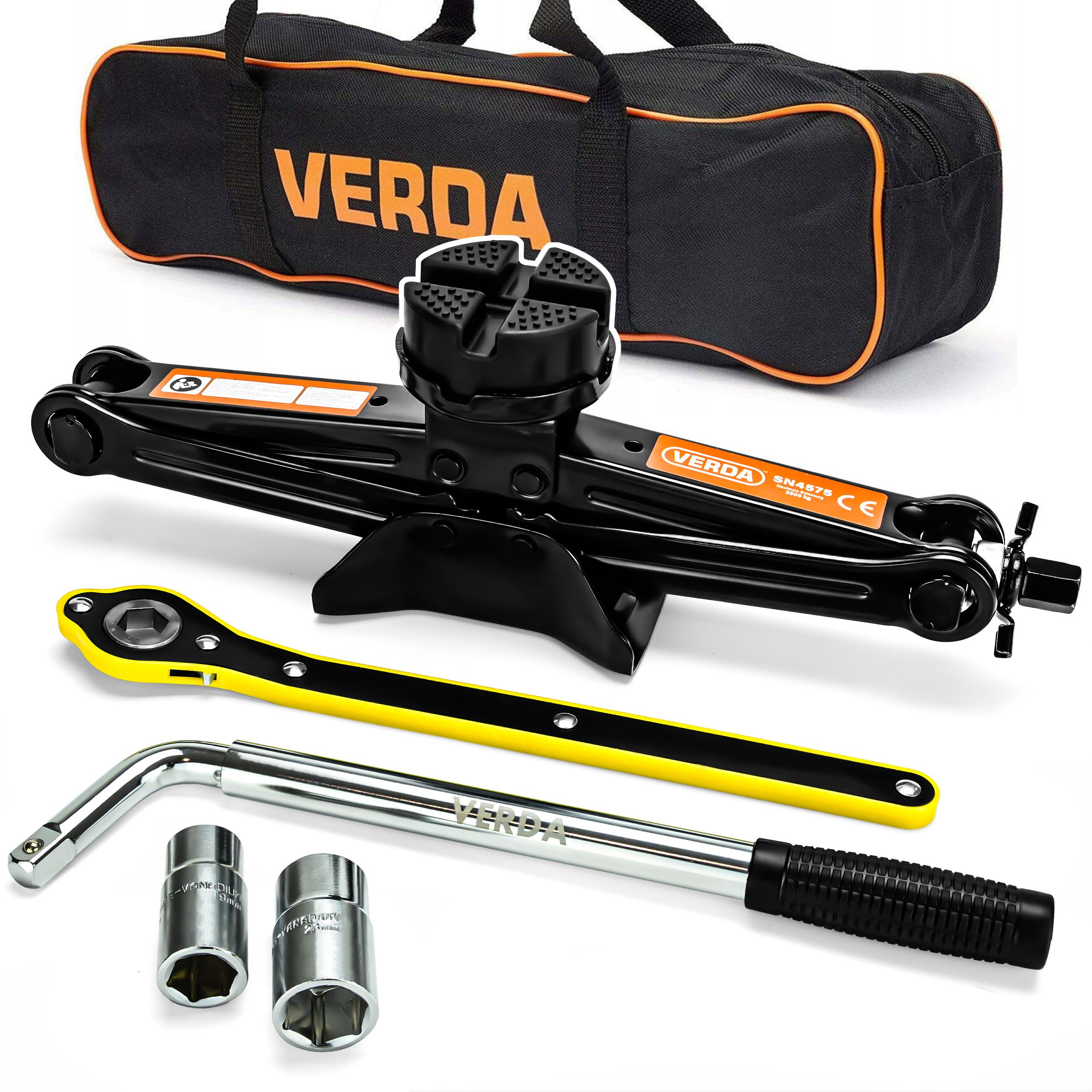 Zestaw podnośnik/lewarek samochodowy z grzechotką, praktycznym pokrowcem oraz kluczem teleskopowym.