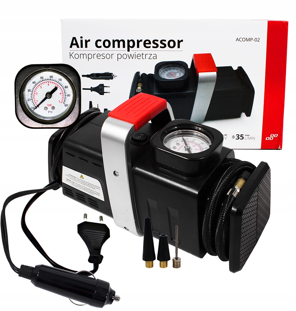 Kompresor posiada przewód zasilający AC 230V o długości 1,8m, dodatkowy długi przewód przewód zasilający DC 12V 3m, oraz wąż ciśnieniowy o długości 55cm, zakończony gwintowana końcówką do pompowania kół samochodów i motocykli oraz antypoślizgowe nóżki. Wysokie ciśnienie w tym wypadku 100psi/7BAR i duża wydajność 35l/min sprawia, że kompresor w kilka chwil pompuje koło każdego samochodu. Do zestawu dołączone są również dwie końcówki do pompowania materacy lub zabawek dmuchanych oraz igła do pompowania piłek.
