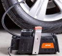 Solidny, kompresor polskiej marki AMIO o wysokiej wydajności i dużej niezawodności. Jego podstawową cechą jest możliwość podłączenia go zarówno do zapalniczki samochodowej DC 12V, jak i do gniazdka sieciowego w domu czyli AC 230V. Posiada przewód ciśnieniowy o długości ok. 55cm zakończony gwintowaną końcówką przeznaczoną na wentyle samochodowe. Gwintowana końcówka zapobiega spadaniu węża w czasie pompowania. Wyposażony jest we wbudowany manometr wyskalowany do 7BAR 100Psi, rączkę do wygodnego przenoszenia oraz specjalne miejsca na zawinięcie kabli, co ułatwia przechowywanie i poprawia estetykę kompresora oraz włącznik umieszczony pod rączką.