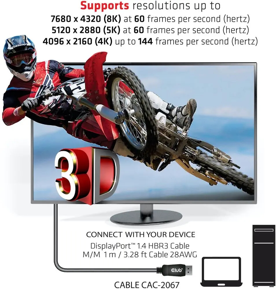 Kabel Club 3D DisplayPort™ 1.4 HBR3 umożliwia podłączenie komputera PC lub laptopa wyposażonego w DisplayPort™ (Gaming) do monitora (Ultra) High Resolution lub innych produktów wyposażonych w DisplayPort™. DisplayPort™ 1.4 zapewnia wsparcie dla wyświetlacza Stream Compression 1.2 (DSC), forward Error Correction i zwiększa maksymalną liczbę kanałów audio Inline do 32. Jest wyposażony w zatrzaskową wtyczkę DisplayPort™, która zapewnia bezpieczne i niezawodne połączenie. Wystarczy nacisnąć wbudowany zamek, aby zwolnić wtyczkę. Delikatna powłoka UltraFlex chroni kabel przed uszkodzeniami spowodowanymi gięciem. Kabel ma 28 AWG i jest w pełni dwukierunkowy. Uwaga!
