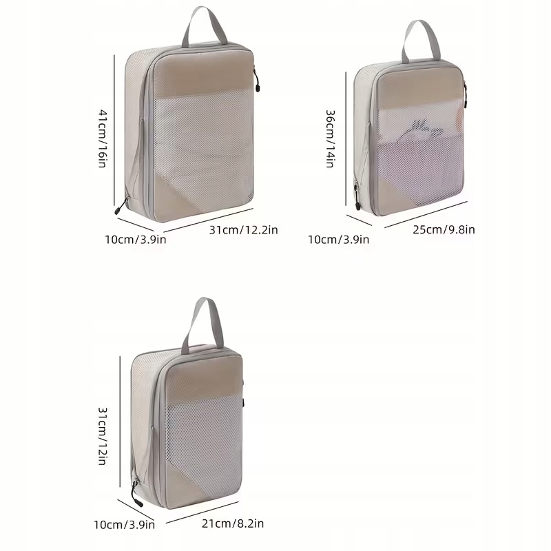 Zestaw zawiera 4 organizery kompresyjne w różnych rozmiarach:20 × 30 × 9 cm, 25 × 36 × 9 cm, 21 × 39 × 8 cm oraz 30 × 40 × 9 cm