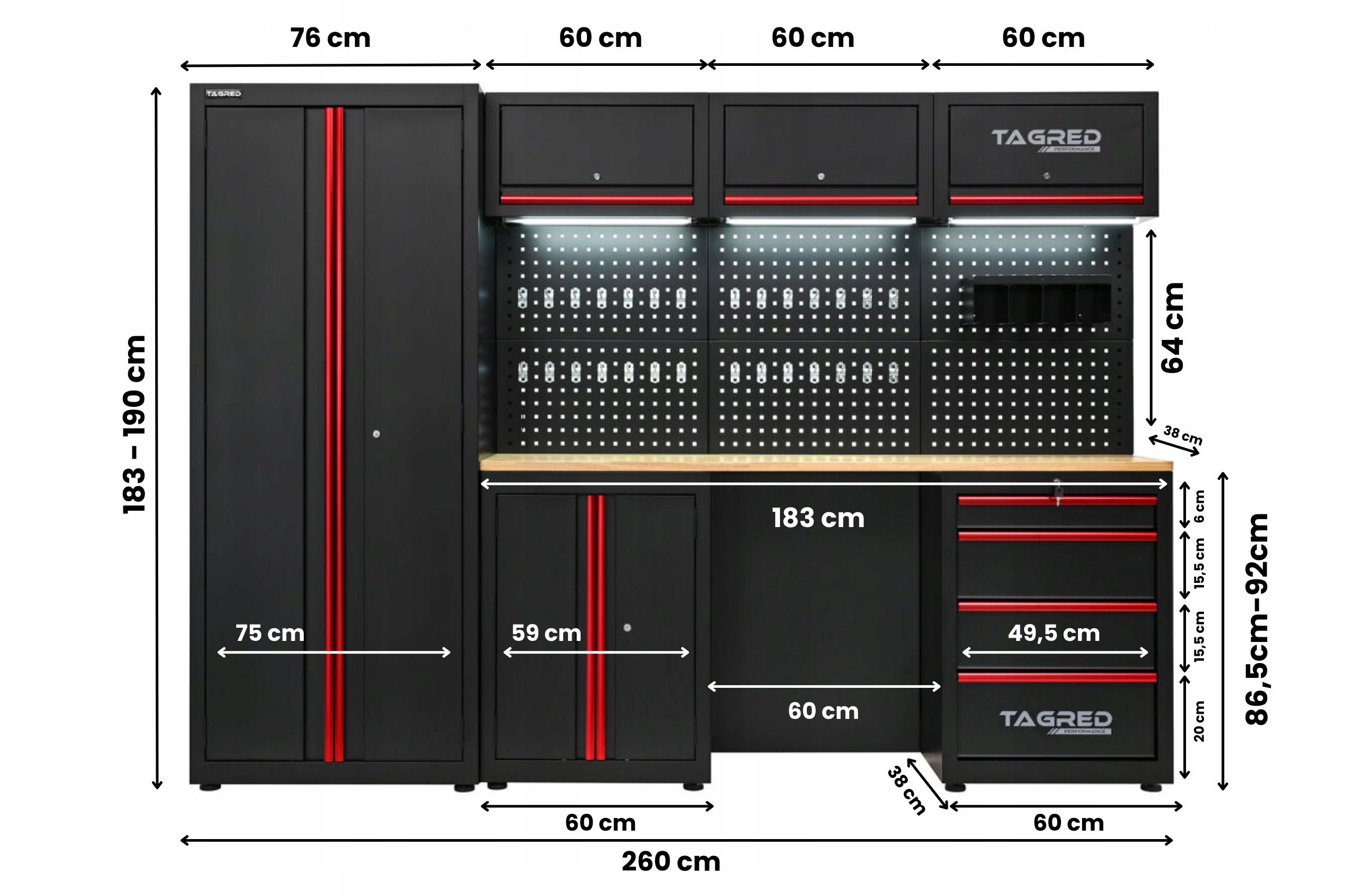 W skład zestawu wchodzą: szafa z półkami, szafa z szufladami, szafa dolna z półką, panel perforowany - tablica narzędziowa oraz blat roboczy.