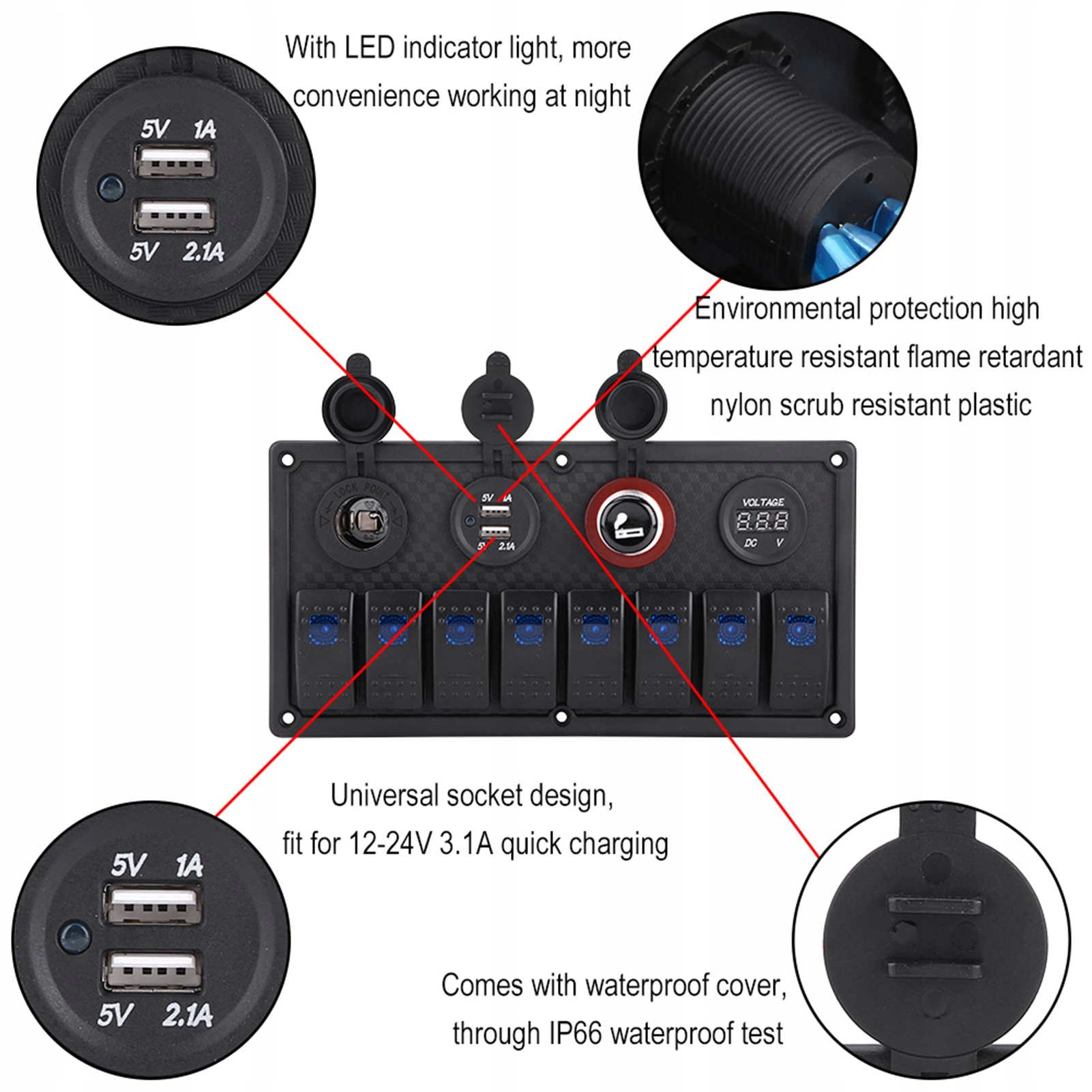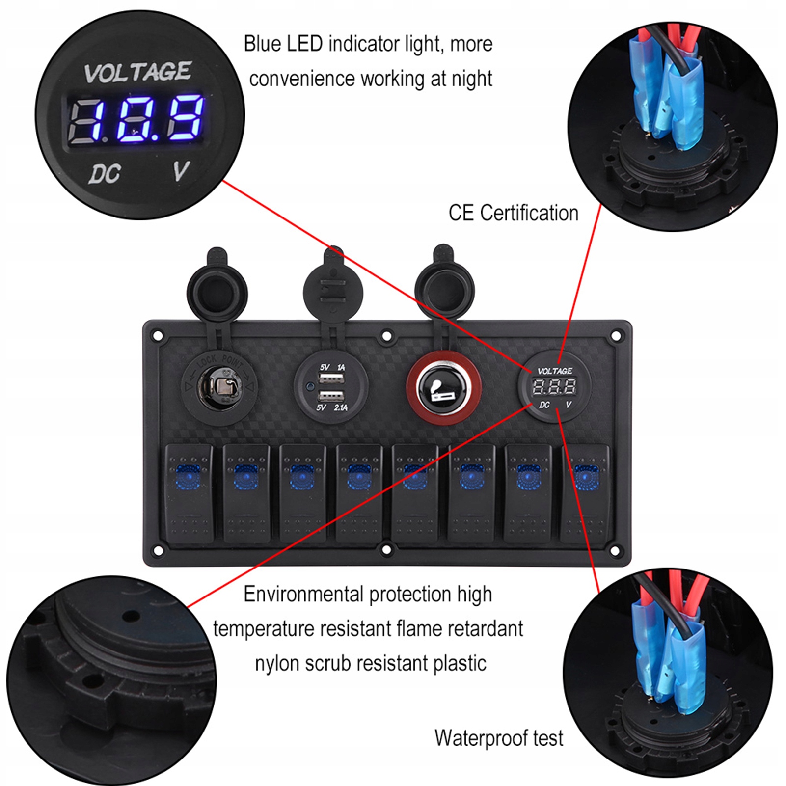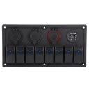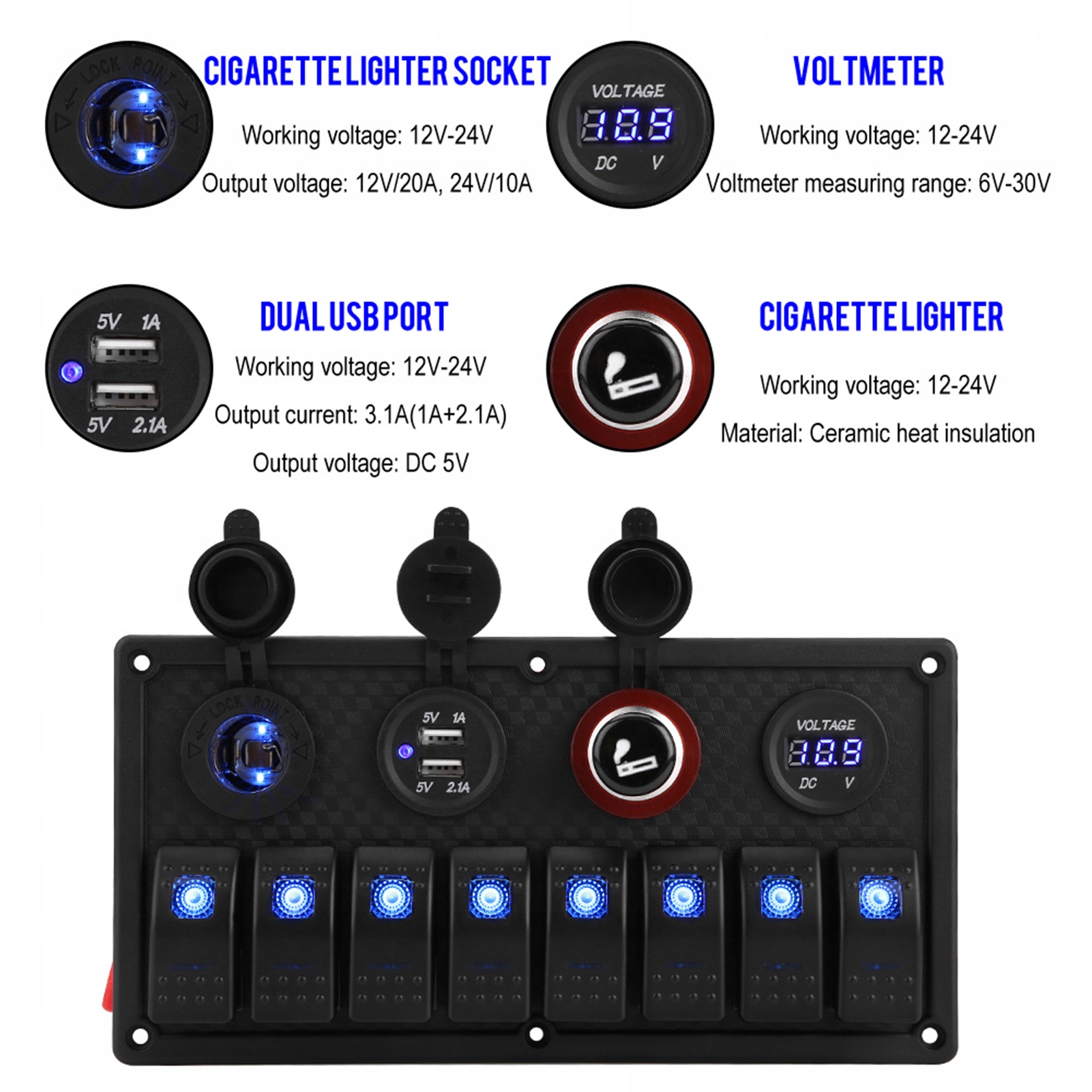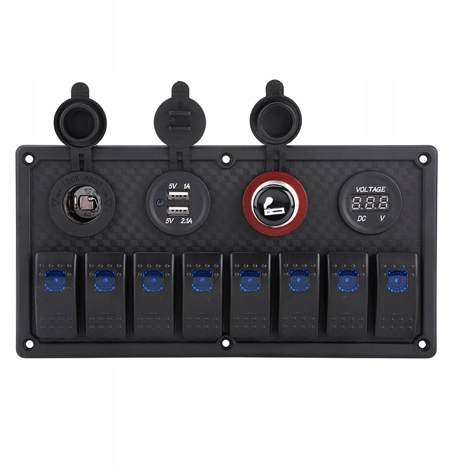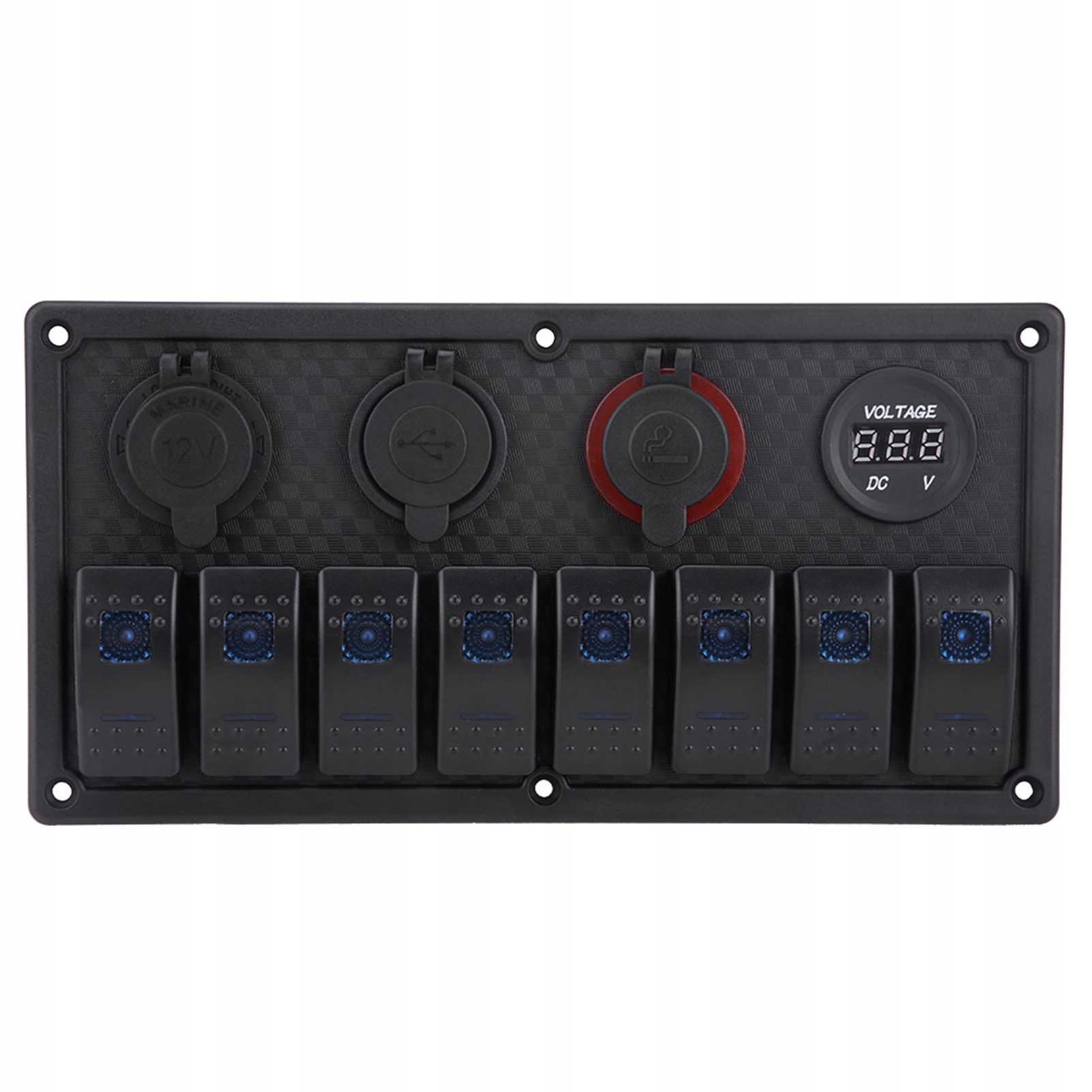 12V 24V 8 Gang Samochód Łódź LED Przeącznik koyskowy Panel sterowania Podwójny woltomierz USB Zapalniczka . ROZDZIELNIA PANEL 8 WŁĄCZNIKÓW 12V 24V PANEL STEROWANIA