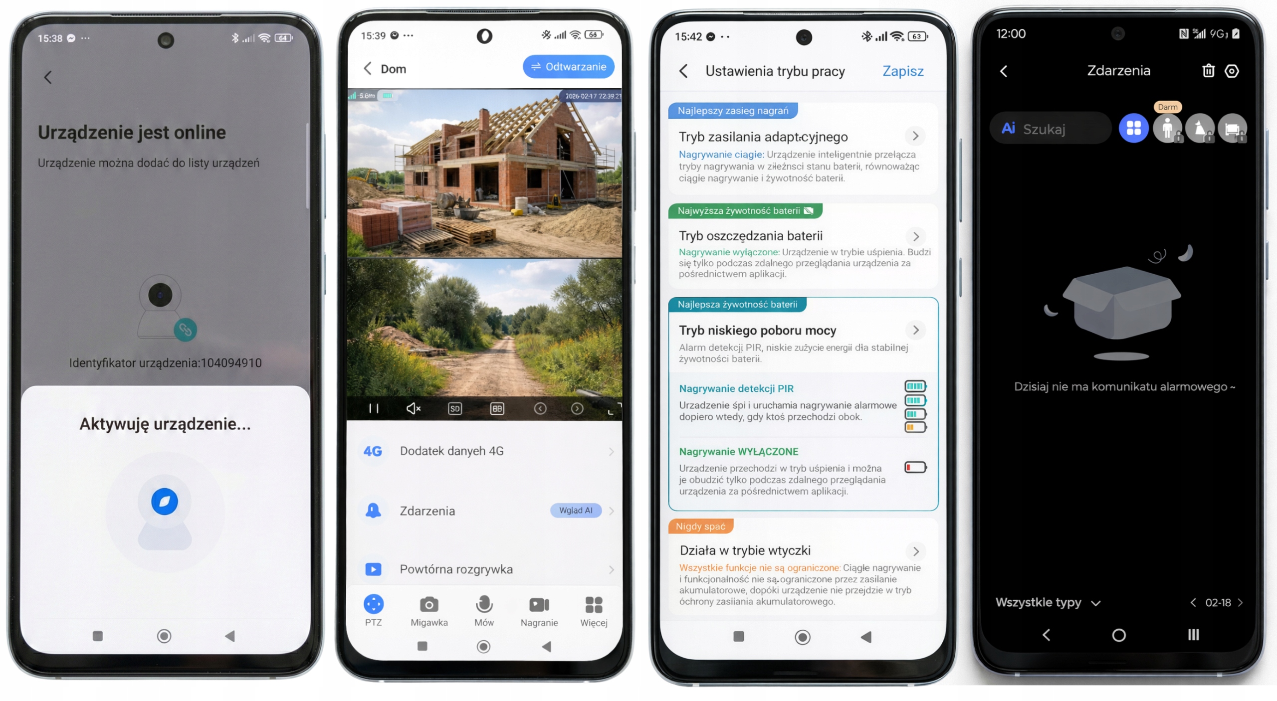 Kamera oferuje 4 tryby działania, które pozwalają świadomie regulować sposób nagrywania oraz poziom zużycia baterii. W zależności od wybranego ustawienia urządzenie może pracować w trybie ciągłym, zrównoważonym, reagować wyłącznie na ruch (PIR) lub przechodzić w tryb czuwania.