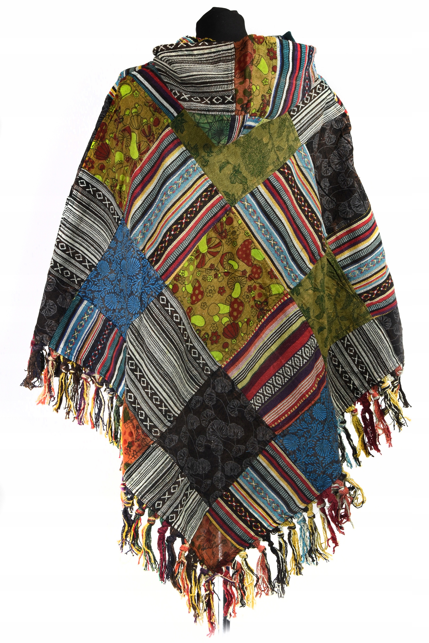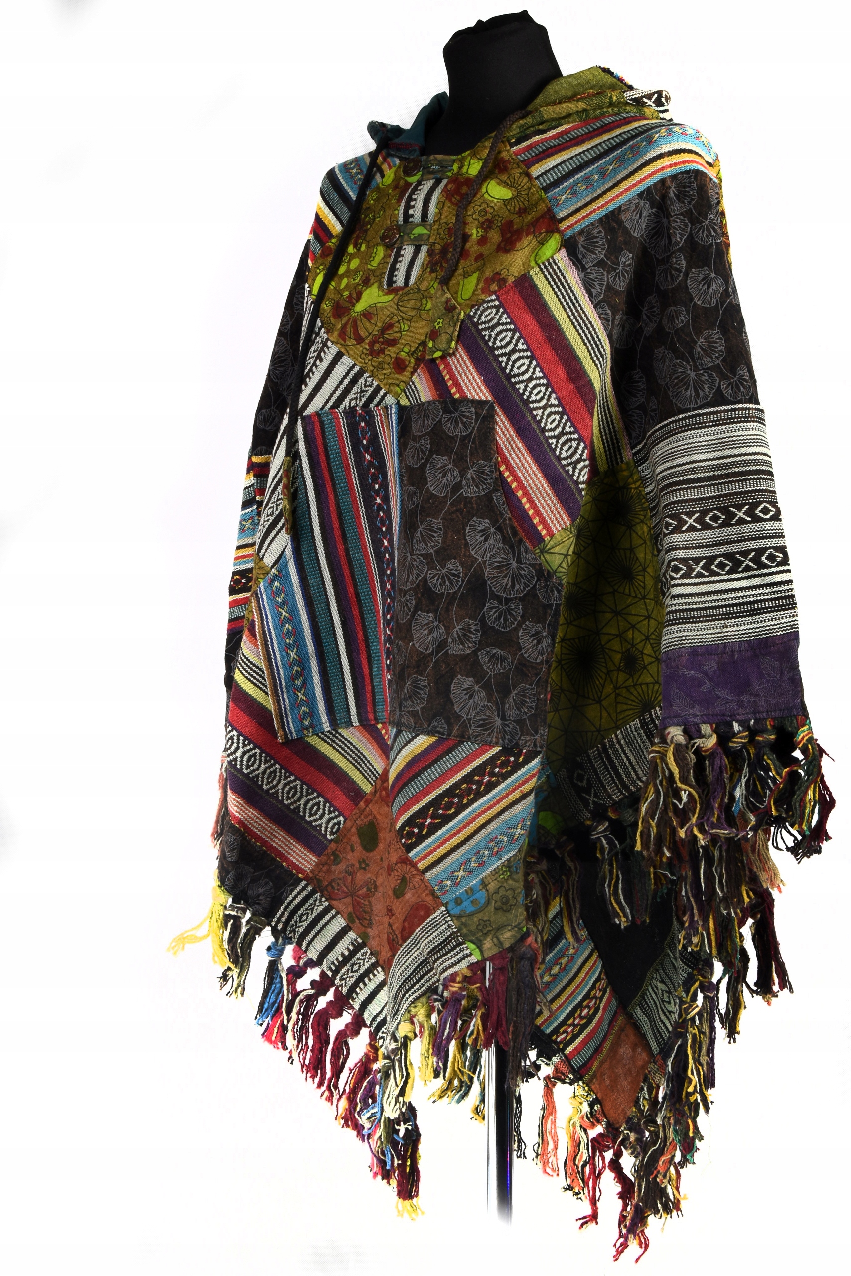 Prezentowane ponczo zostało wykonane z pozszywanych kawałków bawełny (tkanina gheri, tkanina z nadrukiem bawełniana). Posiada kaptur i w górnej części zapinane jest na guziki. Kaptur wyposażony jest w sznurkowy ściągacz. Na przodzie jest naszyta obszerna kieszeń (tzw. kangurka)