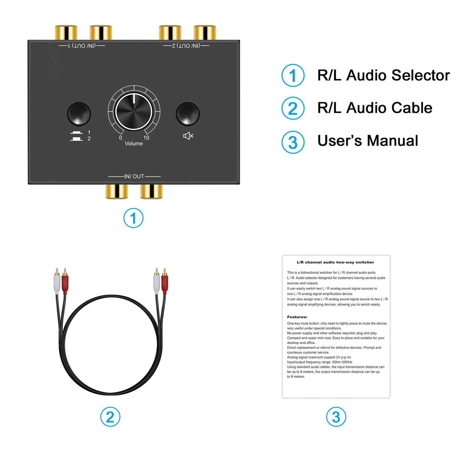 Przełącznik audio stereo L/R Nie wymaga zewnętrznego zasilania Przenośny do biura