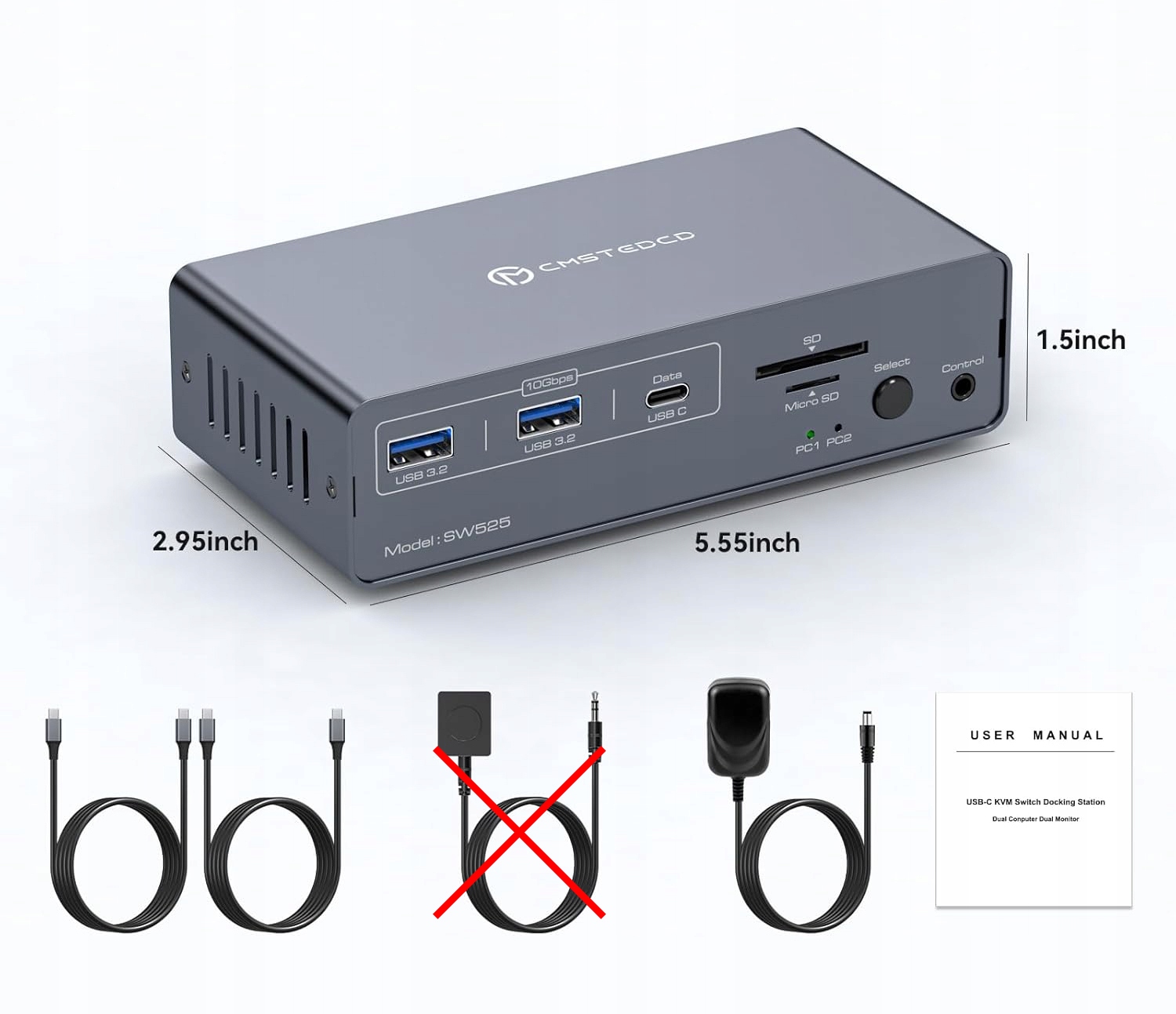 Urządzenie wyposażono w zestaw portów zwiększających funkcjonalność stanowiska: dwa porty USB 3.2 (10 Gb/s), port USB‑C DATA do przesyłu plików (bez wideo), gniazda SD i microSD oraz gniazdo Ethernet 1 Gbps. Jeden port USB 3.0 przeznaczono do podłączenia myszy i klawiatury, co zapewnia płynne i zgodne wstecz połączenie z urządzeniami USB 2.0. Urządzenie posiada również wygodny, zewnętrzny przycisk przełączania umieszczony w bloku kabli dla estetyki biurka.