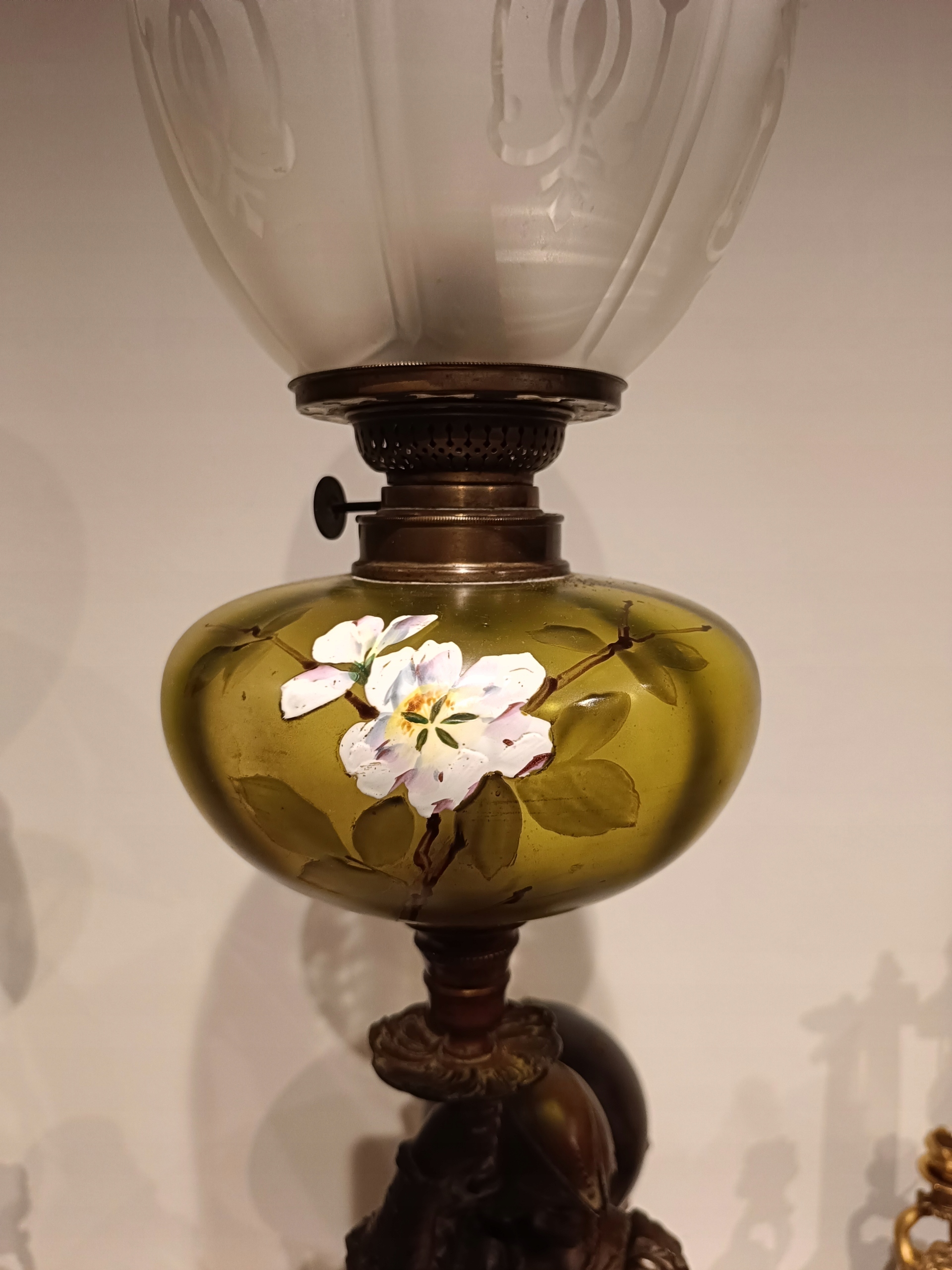 Zbiornik w ręcznie malowanie kwiaty. Maszynka sygnowana. Klosz ładnie zdobiony.