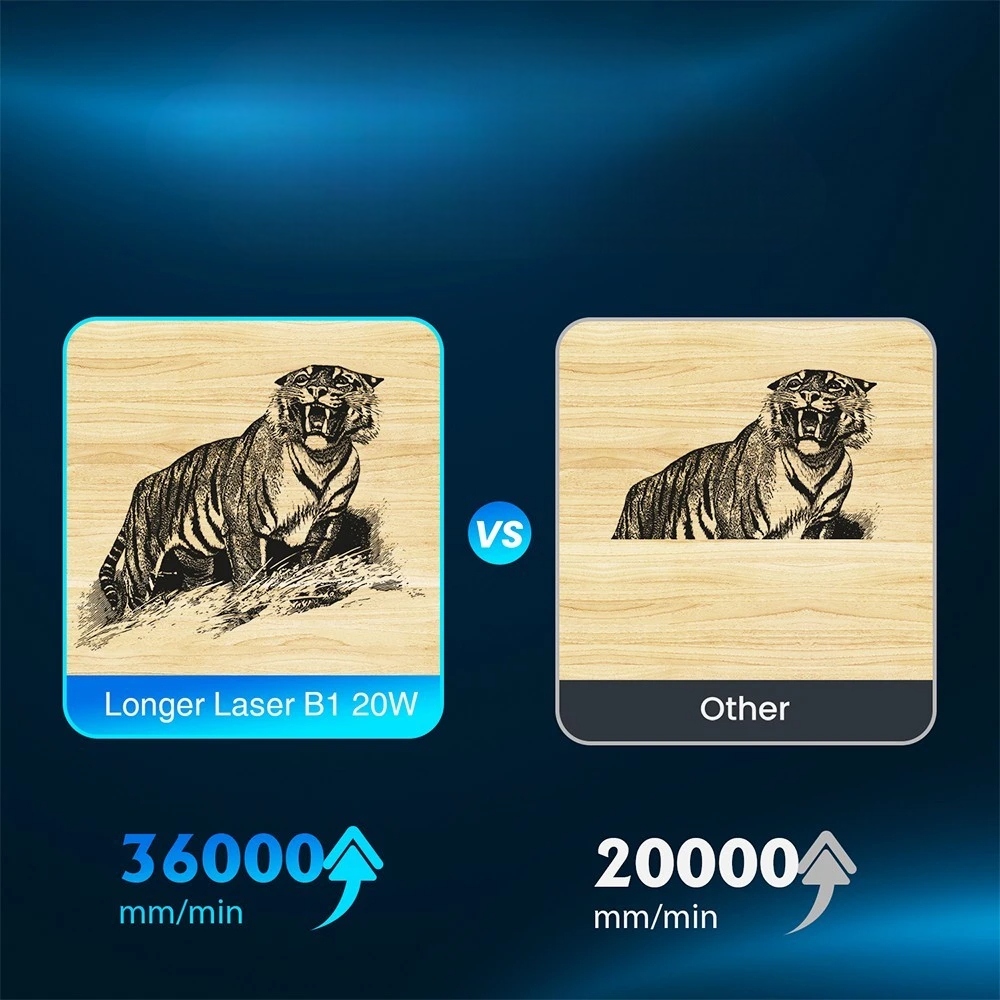 Laser B1 jest wyposażony w nową 32-bitową płytę główną, która umożliwia prędkość grawerowania do 36,000 mm/min, czterokrotnie szybszą niż zwykłe maszyny do grawerowania laserowego. Ponadto ciche przetworniki TMC2209 służą do skutecznego tłumienia hałasu podczas pracy, zapewniając szybsze i przyjemniejsze wrażenia.