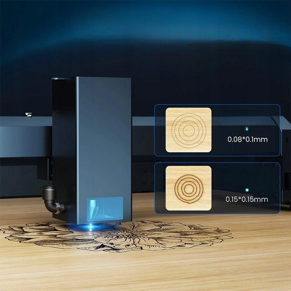 Dzięki najnowocześniejszej technologii sprzęgania laserowego, Laser B1 20W ma cieńszą i longer ogniskową (50mm), ale mocniejszą wiązkę lasera, która zwiększa możliwości cięcia o 20%+ mocniejszą w porównaniu do innych laserów 20W. Może ciąć 20 mm drewno basowe i 35 mm czarny akryl z wieloma przejściami.