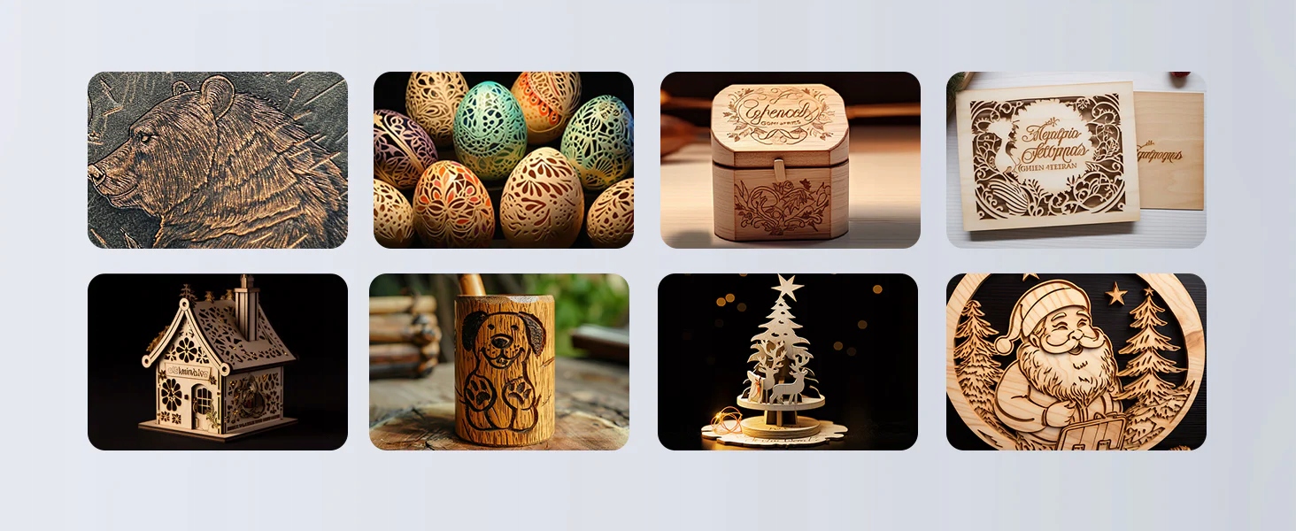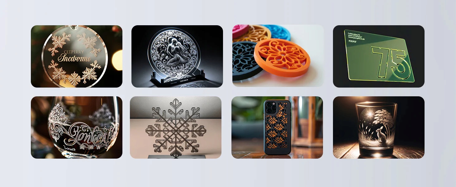 Dzięki mocy lasera 20-24 W i potężnym możliwościom cięcia i grawerowania laser B1 może ciąć lub grawerować ponad 1,000 materiałów, takich jak drewno, stal nierdzewna, skóra, srebro, akryl, tkaniny i inne.