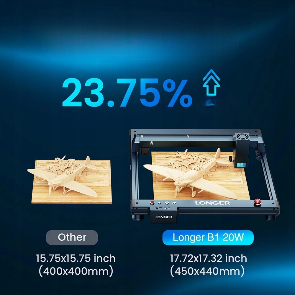 Obszar roboczy 17.72 x 17.32 cala / 450 x 440 mm, Laser B1 20W zapewnia 23.75% wzrost wielkości roboczej w porównaniu z innymi, co spełnia większość scenariuszy, szczególnie idealne dla paneli A3.