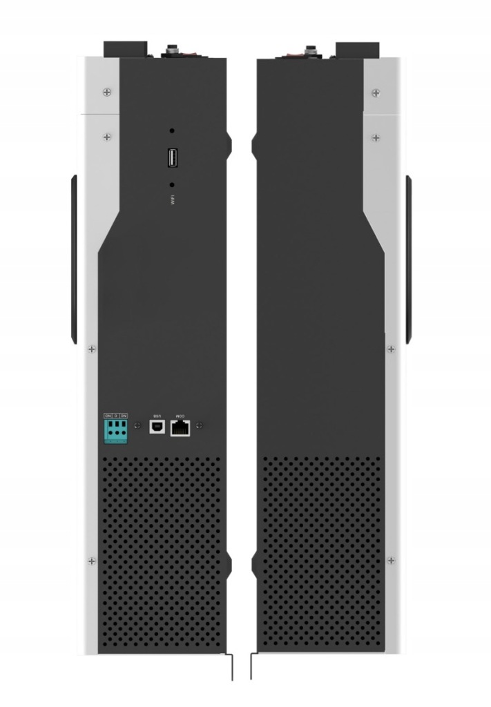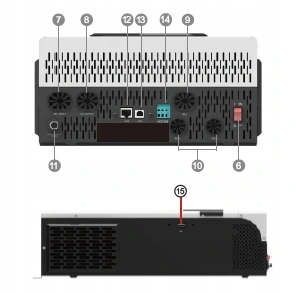 6. Przycisk ON/OFF 7. Wejście AC 8. Wyjście AC 9. Wejście PV 10. Wejście akumulatora 11. Wyłącznik obwodu 12. Port Rs485 13. USB 14.Komunikacyjny styk beznapięciowy dry contact 15. Wejście USB do modułu WiFi