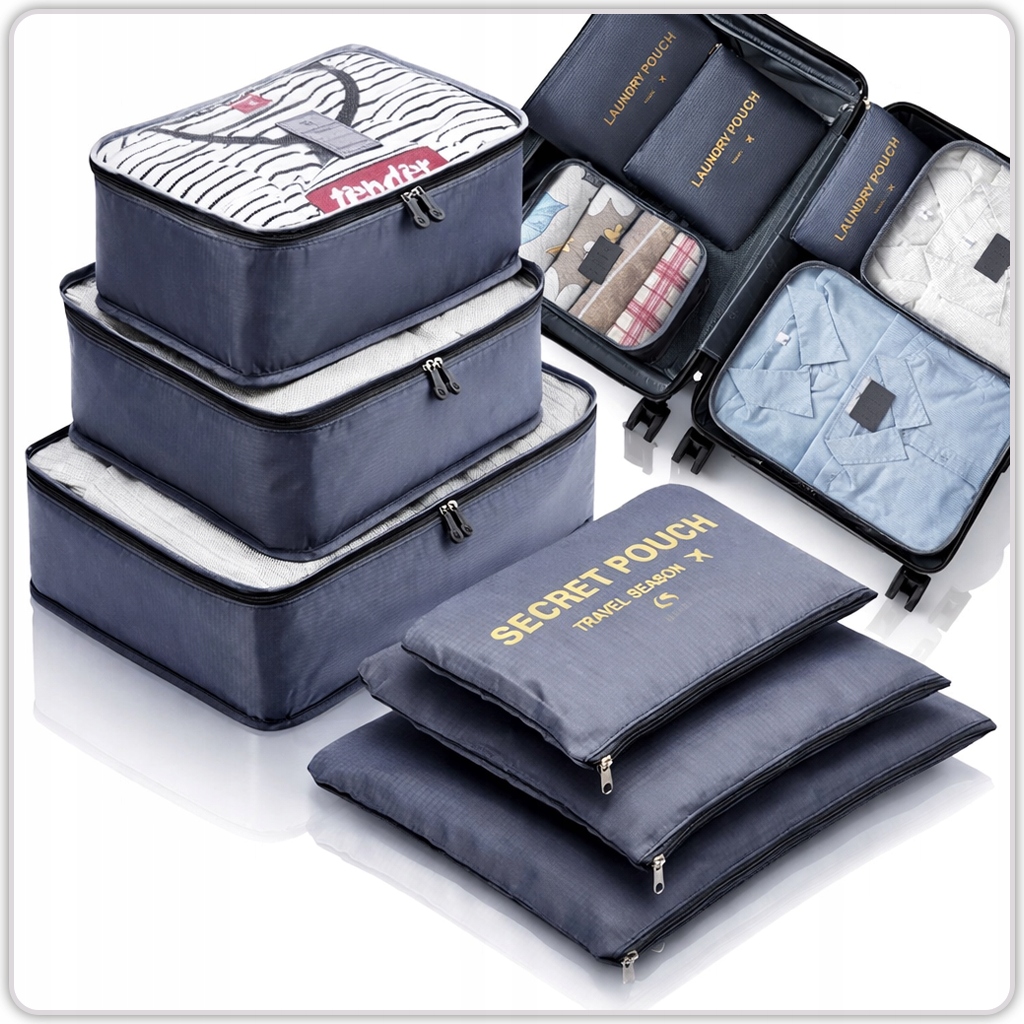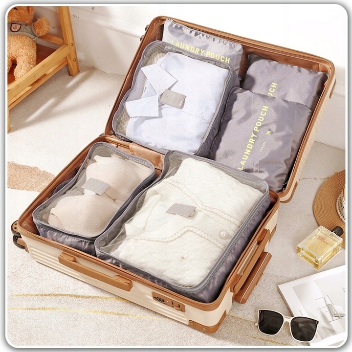 ⭐ Komplet sześciu organizerów podróżnych, świetnie sprawdzi się do spakowania wszystkich potrzebnych rzeczy takich jak np: bielizna, obuwie, ubrania czy kosmetyki oraz do przechowywania bielizny do prania.