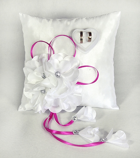 Poduszki mają wymiar ok. 19x19 cm , wykonane są z satyny, ozobione są pięknymi, satynowymi kwiatami "3 D" z których każy ozdobiony jest w środku kryształkiem oraz wykończone dodatkiem wstążeczek. Bardzo ciekawy efekt nadają zwisające na satynowych tasiemkach "pączki " kwiatów.