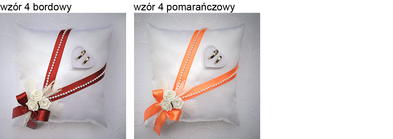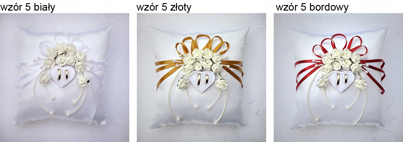 Oferujemy Państwu eleganckie, ręcznie zdobione poduszeczki do podawania obrączek. Poduszki mają wymiar ok. 19x19 cm , wykonane są z błyszczącej satyny (białej lub ecru ), każda z nich posiada przymocowane etui jubilerskie, w które wkłada się obrączki. Umożliwia to bezpieczny "transport" obrączek, bez obaw o ich spadnięcie z poduszki. Jest to również dużo bezpieczniejszy i wygodniejszy sposób mocowania niż np. wiązanie obrączek wstążeczką do poduszki. Każda poduszka ma pod spodem wszytą wstążkę, aby było wygodniej trzymać ja na ręku - dzięki temu poduszeczka nie zsunie się z ręki ;)