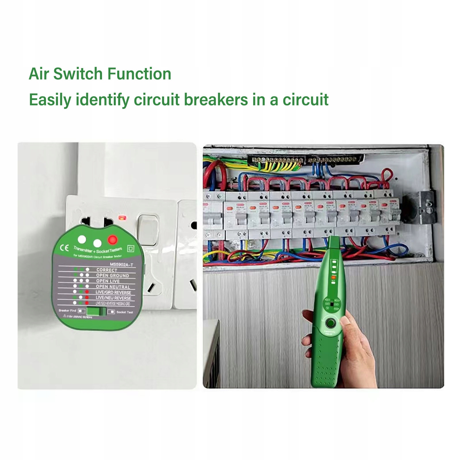 Fture 1. Gówna funkcja: Wyszukiwarka wyącznika obsuguje automatyczną regulację czuości w celu szybkiego zlokalizowania docelowego wyącznika lub bezpiecznika, zapewniając bezpieczną moc.