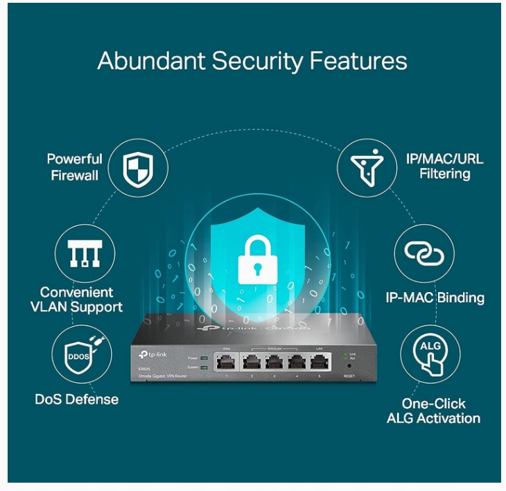 • Niezawodne zabezpieczenia: Zaawansowane reguły zapory sieciowej, ochrona przed atakami DoS, filtrowanie adresów IP/MAC/URL zapewniają ochronę sieci i danych. :