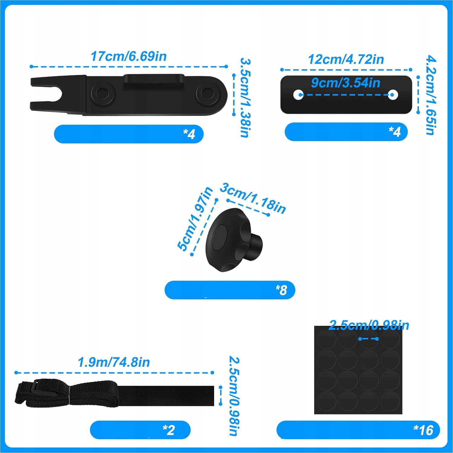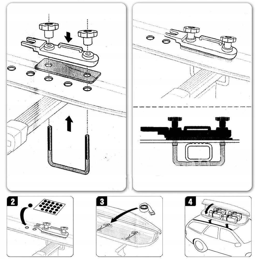 Ten zestaw akcesoriów do bagażnika dachowego zawiera 4 śruby w kształcie litery U, 4 gumowe podkładki, 4 płyty nośne z tworzywa sztucznego, 8 nakrętek zabezpieczających o wysokiej wydajności, 2 bandaże.