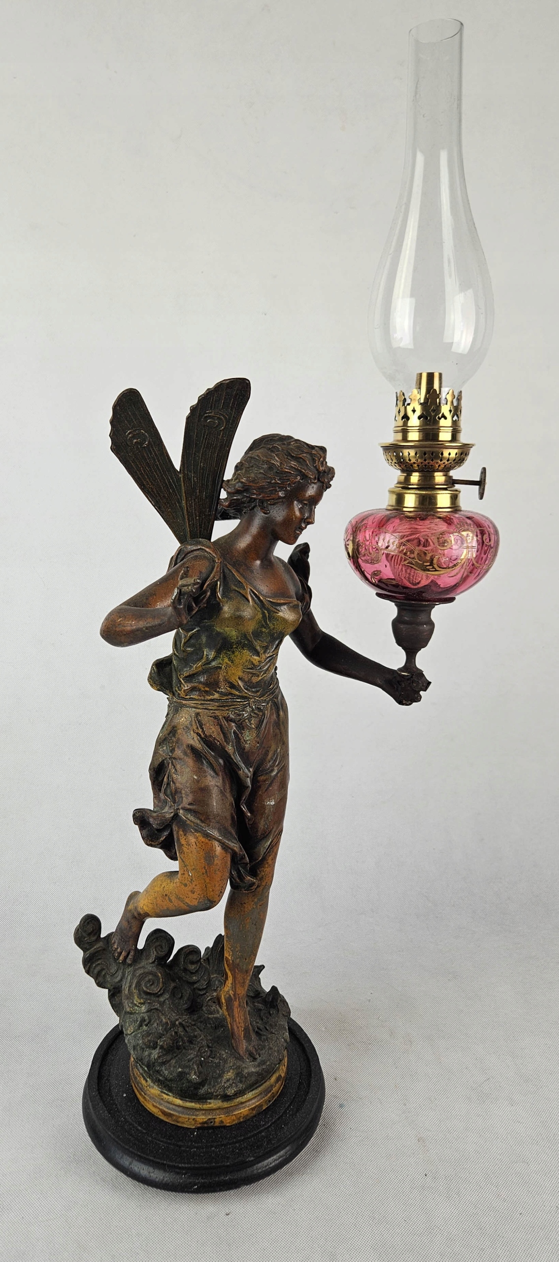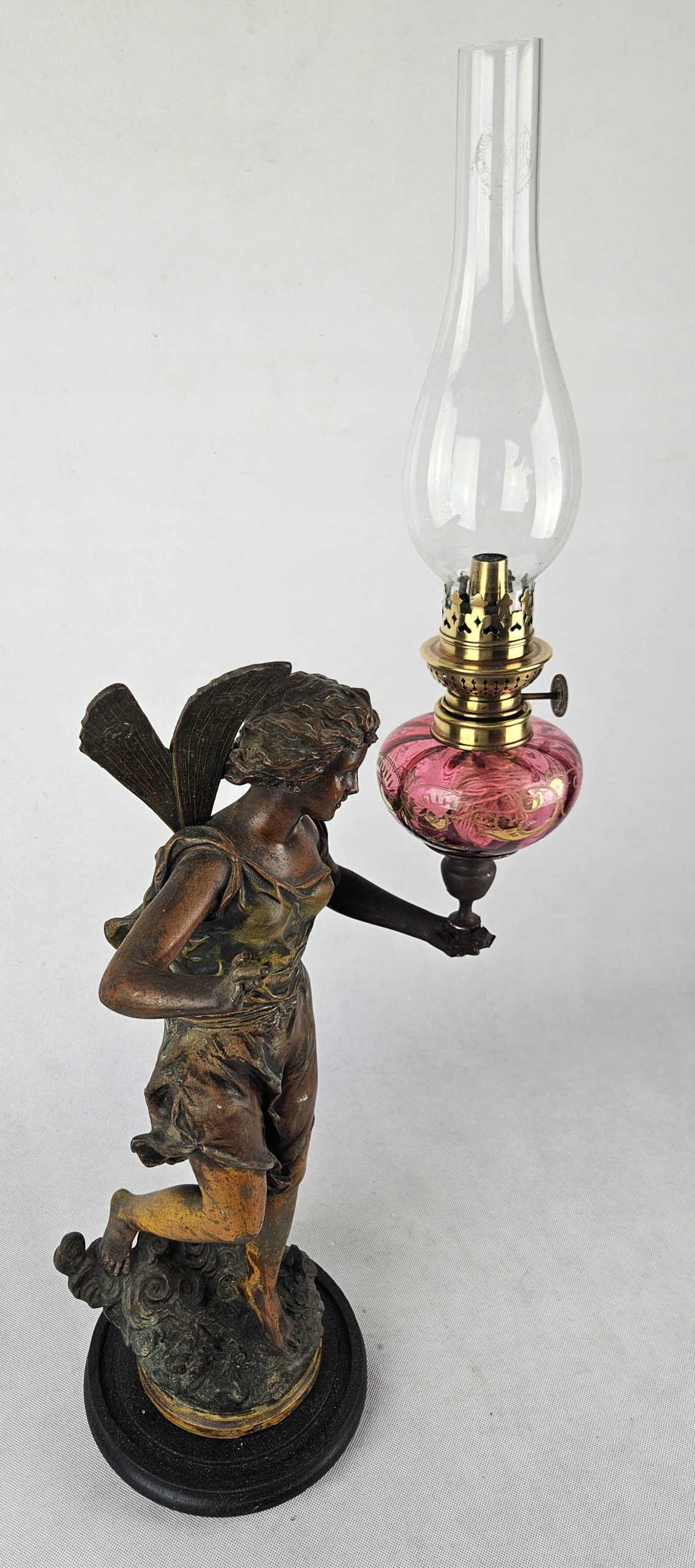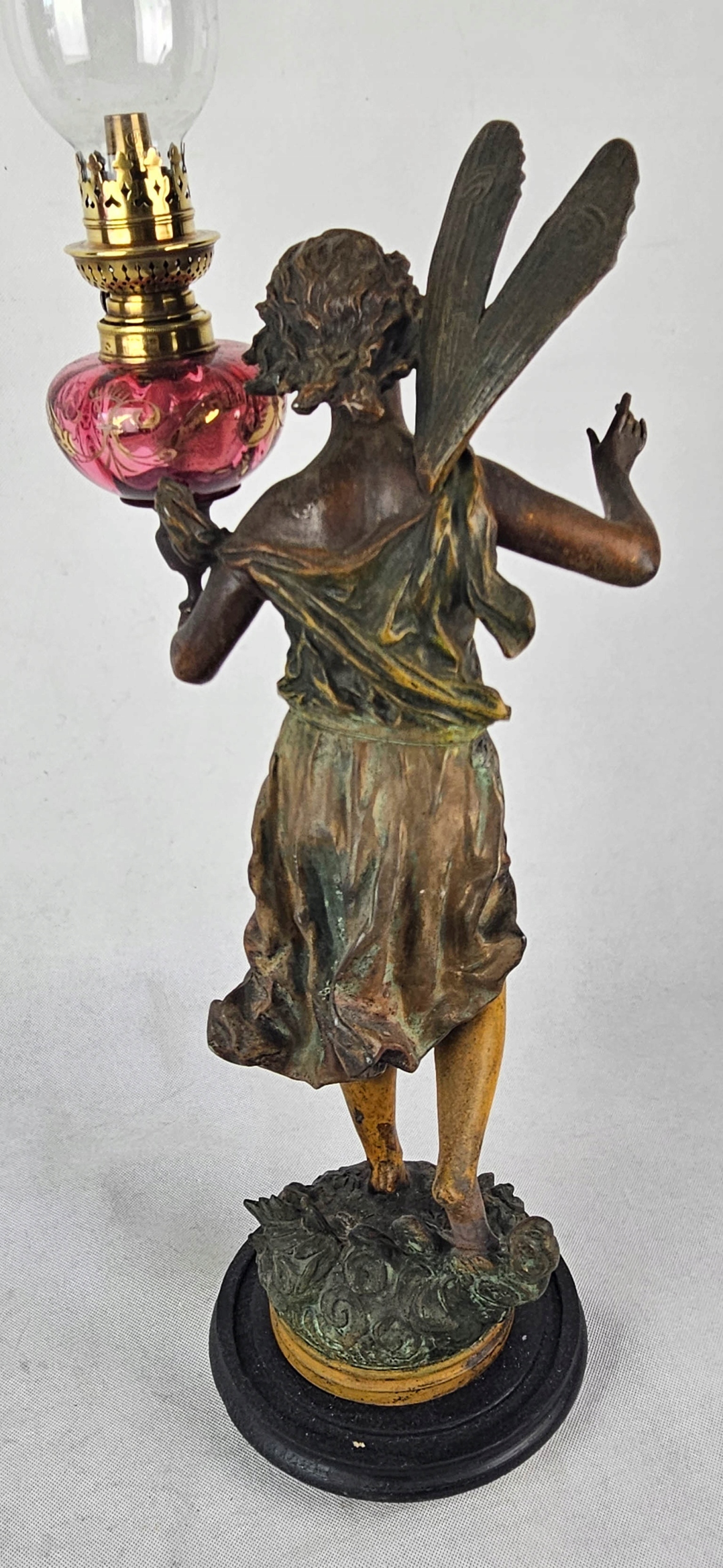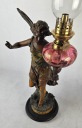 Mam do zaoferowania piękną figuralną lampę naftową z przełomu XIX i XX w Lampa przedstawia postać kobiecą ( Wróżka kwiatów ) autorstwa francuskiego rzeźbiarza Ernesta Rancouleta (1842–1918) Figura wykonana z cynkalu brązowionego. Zbiornik na naftę oryginalny barwiony na różowo z oryginalnymi złoceniami. Figura sygnowana oryginalnym podpisem rzeźbiarza w podstawie ( ostatnie zdjęcie ) Sama podstawa drewniana. Brenner lampy typ kosmos sygnowany sygnaturą Wild & Wessel, Berlin . Zbiornik szczelny . Piękny przedmiot zarówno ozdobny jak i użytkowy. Lampa w pełni sprawna. Stan jak na zdjęciach. Przed zakupem mogę udzielić bardziej szczegółowych informacji lub wysłać dodatkowe zdjęcia przedmiotu.