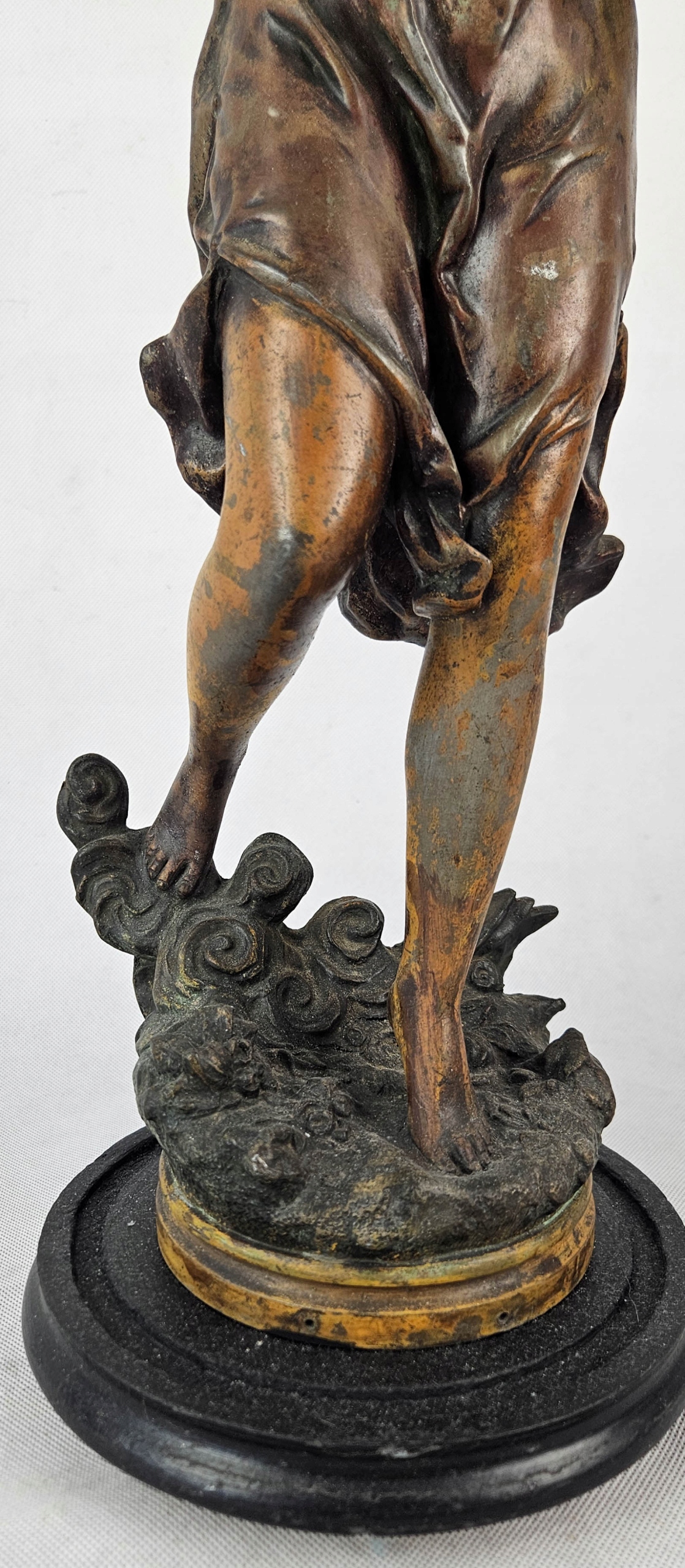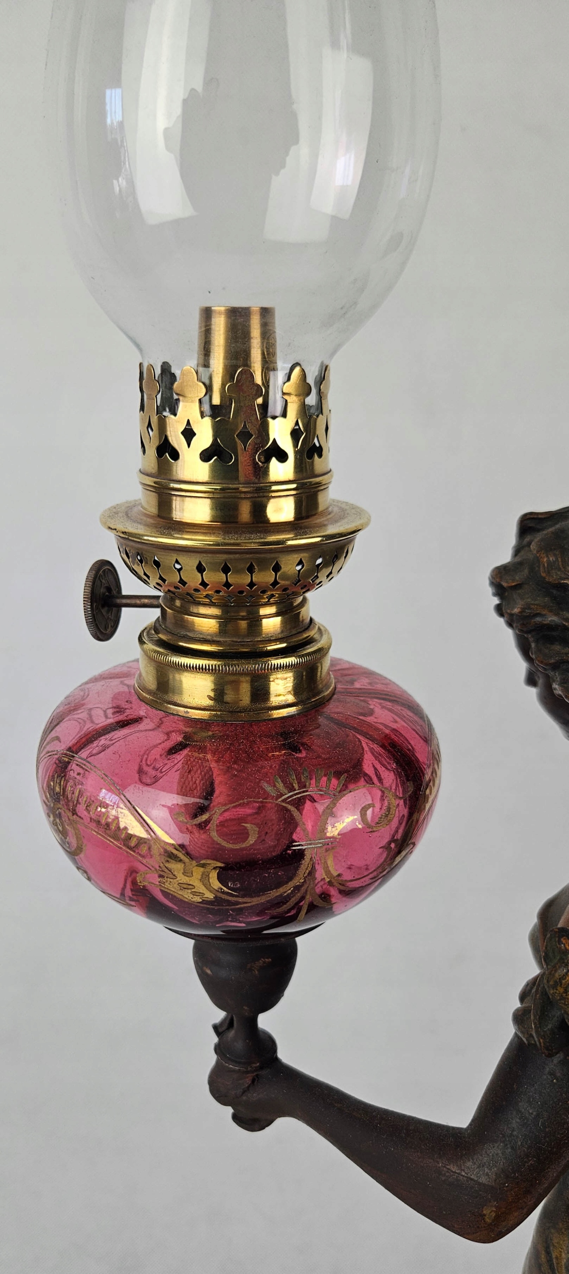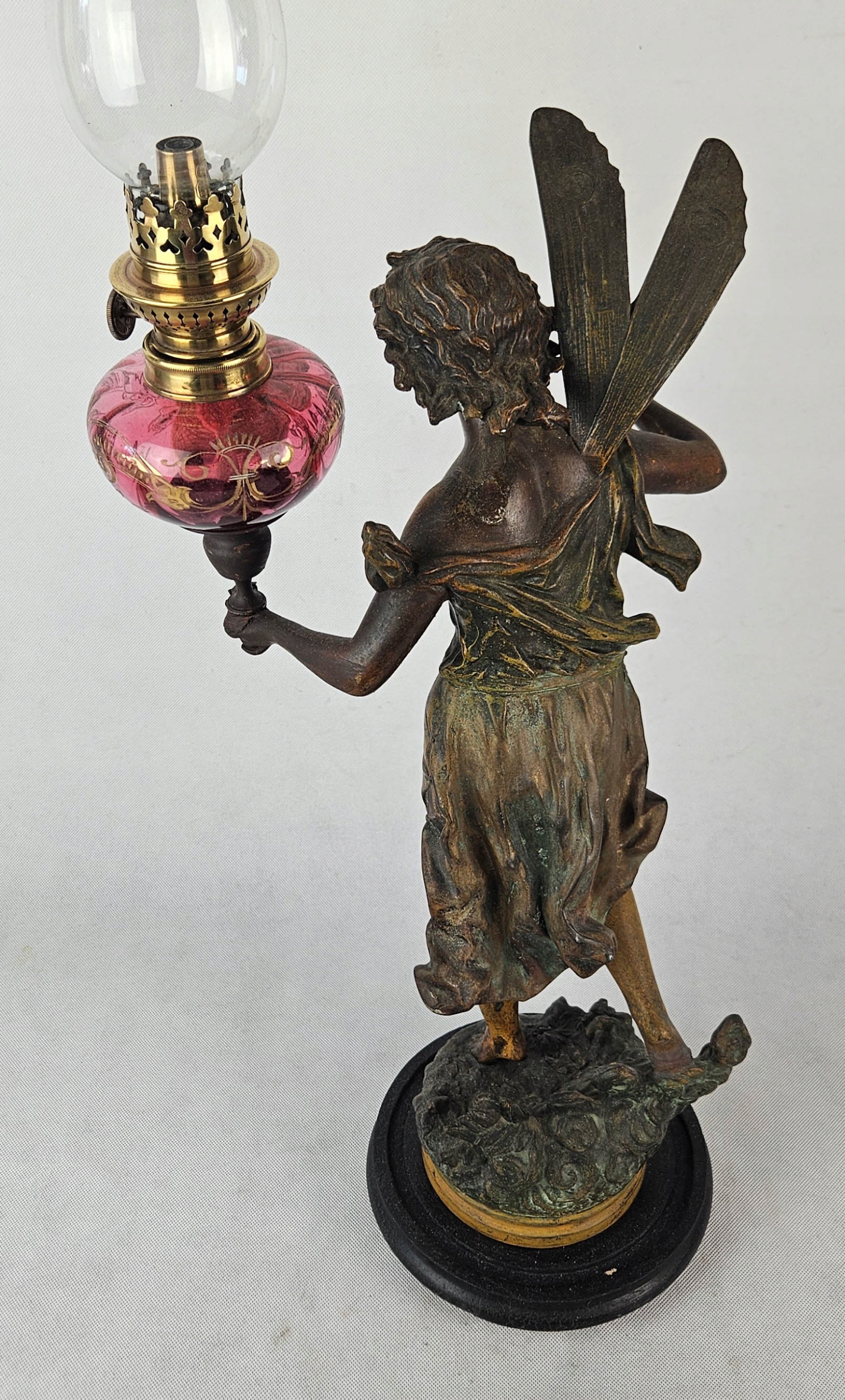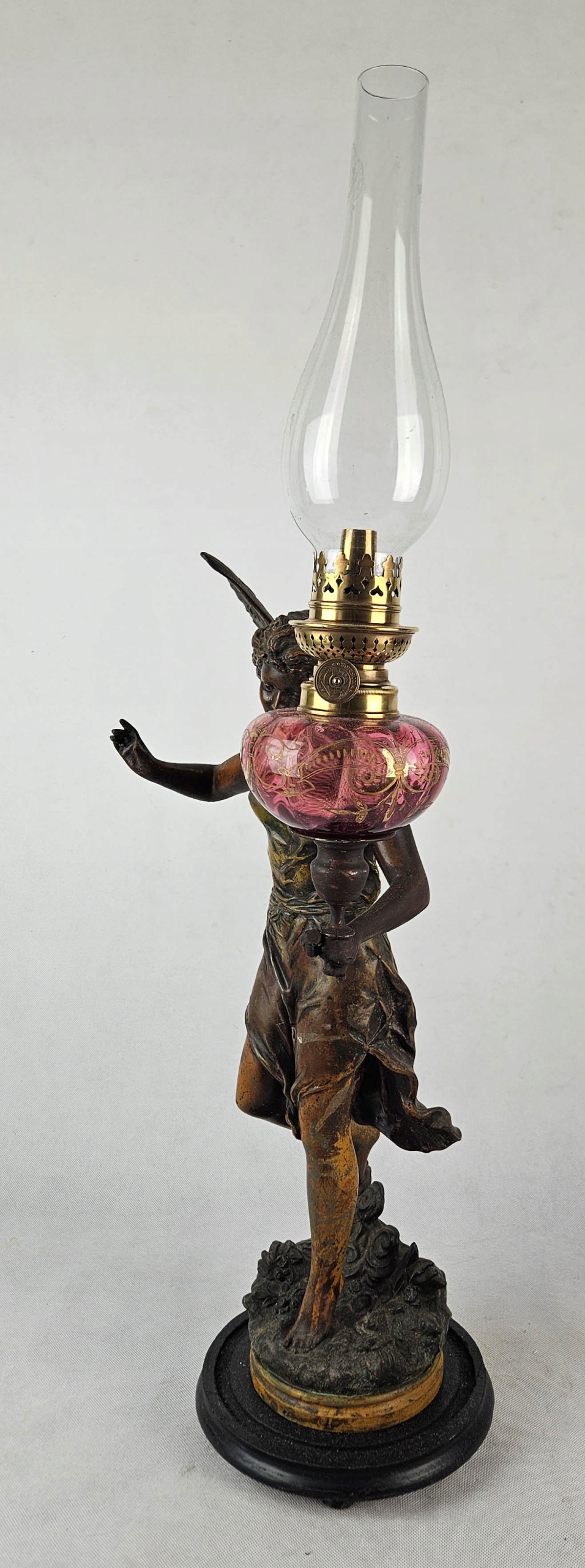 Mam do zaoferowania piękną figuralną lampę naftową z przełomu XIX i XX w Lampa przedstawia postać kobiecą ( Wróżka kwiatów ) autorstwa francuskiego rzeźbiarza Ernesta Rancouleta (1842–1918) Figura wykonana z cynkalu brązowionego. Zbiornik na naftę oryginalny barwiony na różowo z oryginalnymi złoceniami. Figura sygnowana oryginalnym podpisem rzeźbiarza w podstawie ( ostatnie zdjęcie ) Sama podstawa drewniana. Brenner lampy typ kosmos sygnowany sygnaturą Wild & Wessel, Berlin . Zbiornik szczelny . Piękny przedmiot zarówno ozdobny jak i użytkowy. Lampa w pełni sprawna. Stan jak na zdjęciach. Przed zakupem mogę udzielić bardziej szczegółowych informacji lub wysłać dodatkowe zdjęcia przedmiotu.
