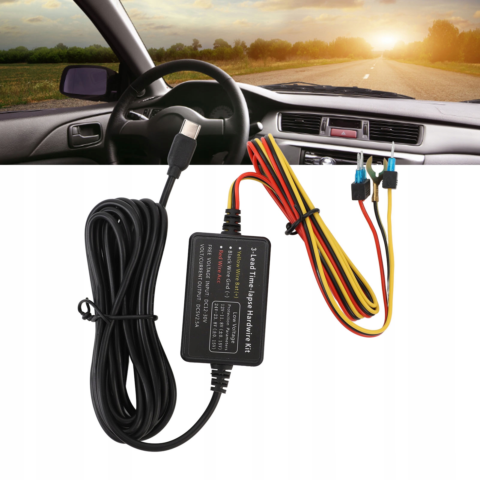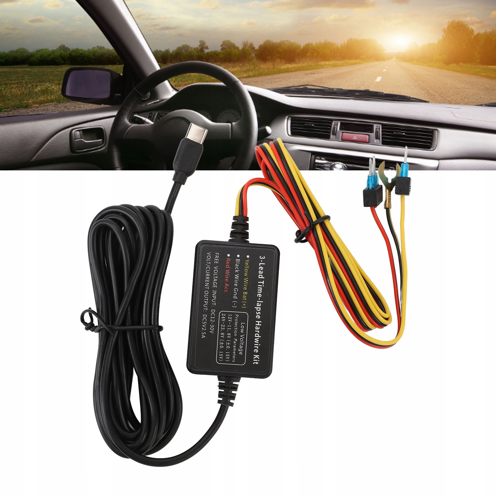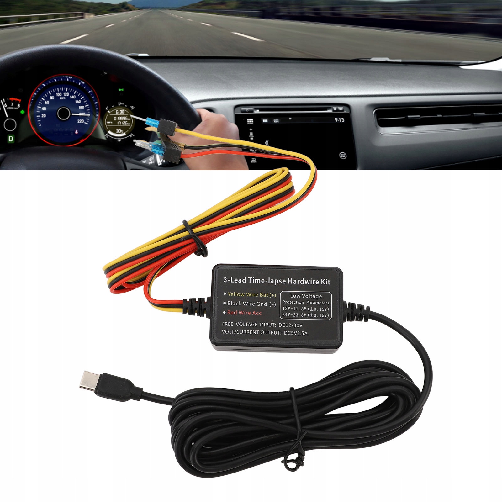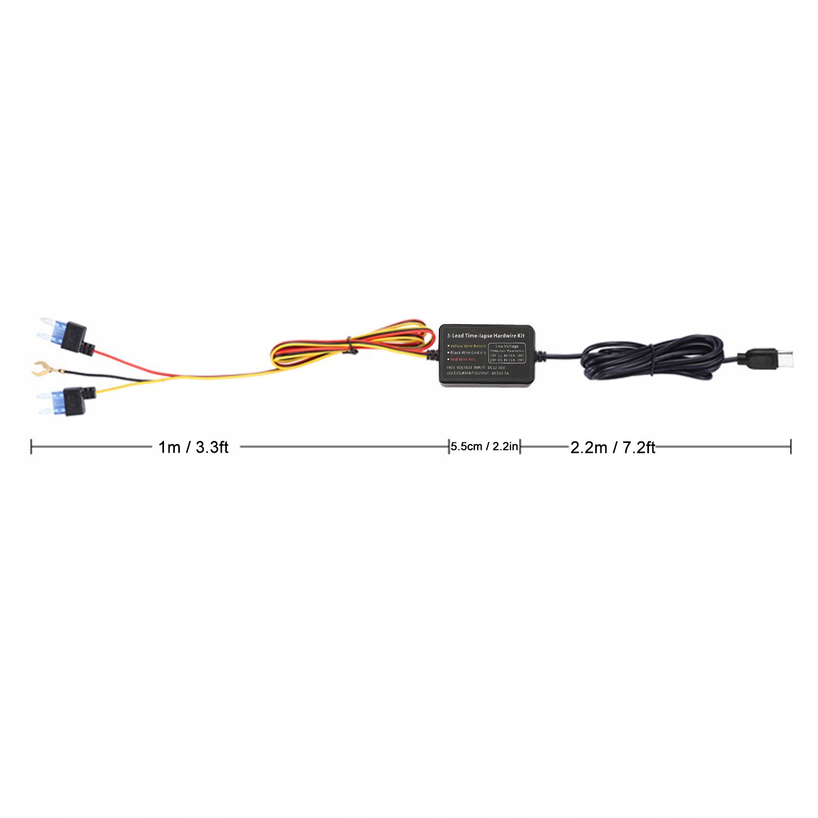 Zastosowanie: Zestaw okablowania do podłączenia akumulatora samochodowego lub zasilacza skrzynki bezpieczników do kamery samochodowej, zapewniający 24-godzinne nieprzerwane zasilanie; wbudowane zabezpieczenia chronią Twoje urządzenie przed nadmiernym prądem i przegrzaniem.