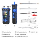 Funkcja testowania nadajnika: w tym testowanie ciągłości kabla, skanowanie kabli, miganie portów, pomiar długości kabla, test PoE, testowanie QC dla kryształowa opaska na głowę, OPM (miernik mocy optycznej) i VFL (usterka wizualna lokalizacja) funkcji.