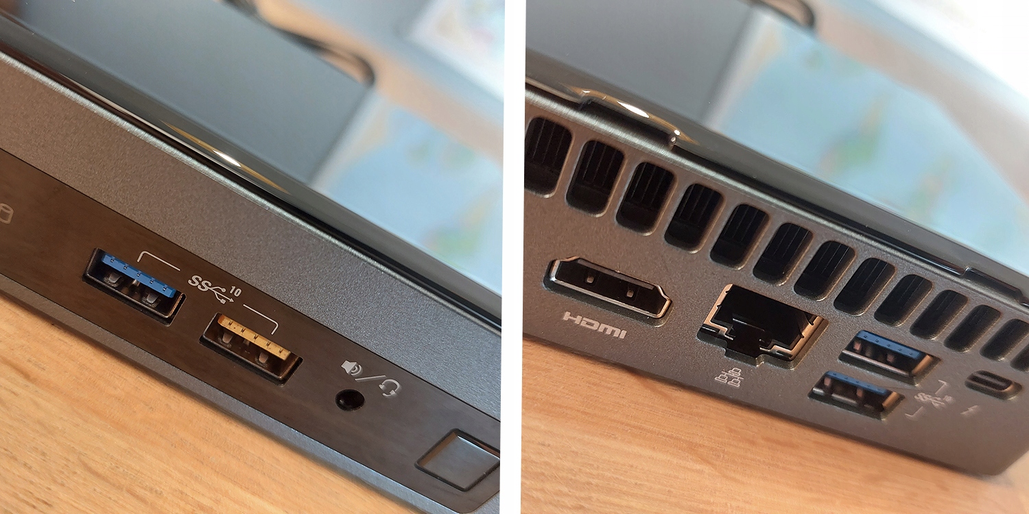 Pomimo małych rozmiarów komputer oferuje szerokie możliwości podłączenia urządzeń i akcesoriów. Znajdziesz tu nowoczesne złącza, które pozwalają wygodnie korzystać z monitora, pamięci zewnętrznych, słuchawek czy dodatkowych akcesoriów.