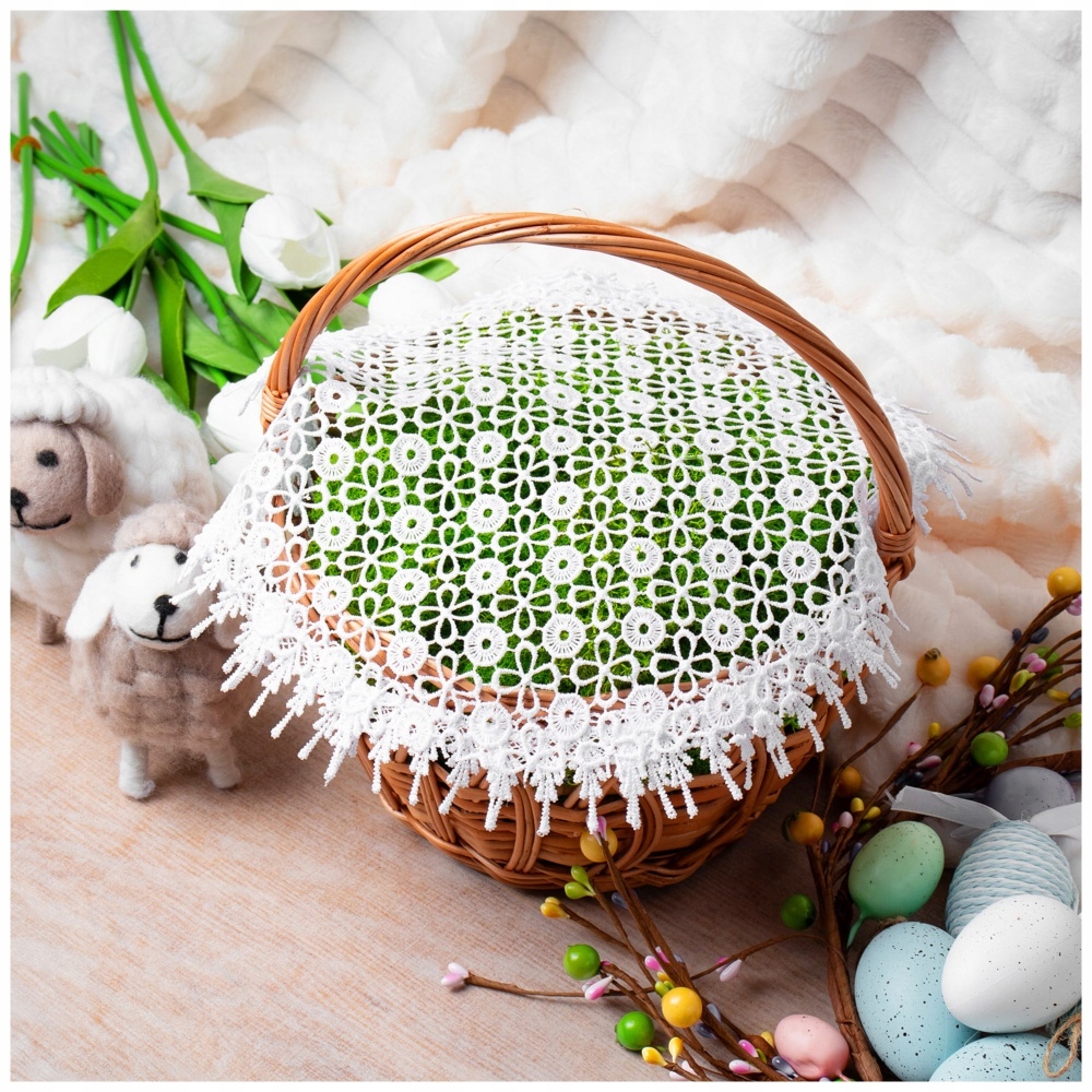Koszyk, dekoracje i cała aranżacja widoczna na zdjęciach służą wyłącznie celom poglądowym i nie są częścią oferty. Sprzedajemy tylko piękną, BIAŁĄ serwetkę, idealną do ozdobienia koszyczka wielkanocnego.