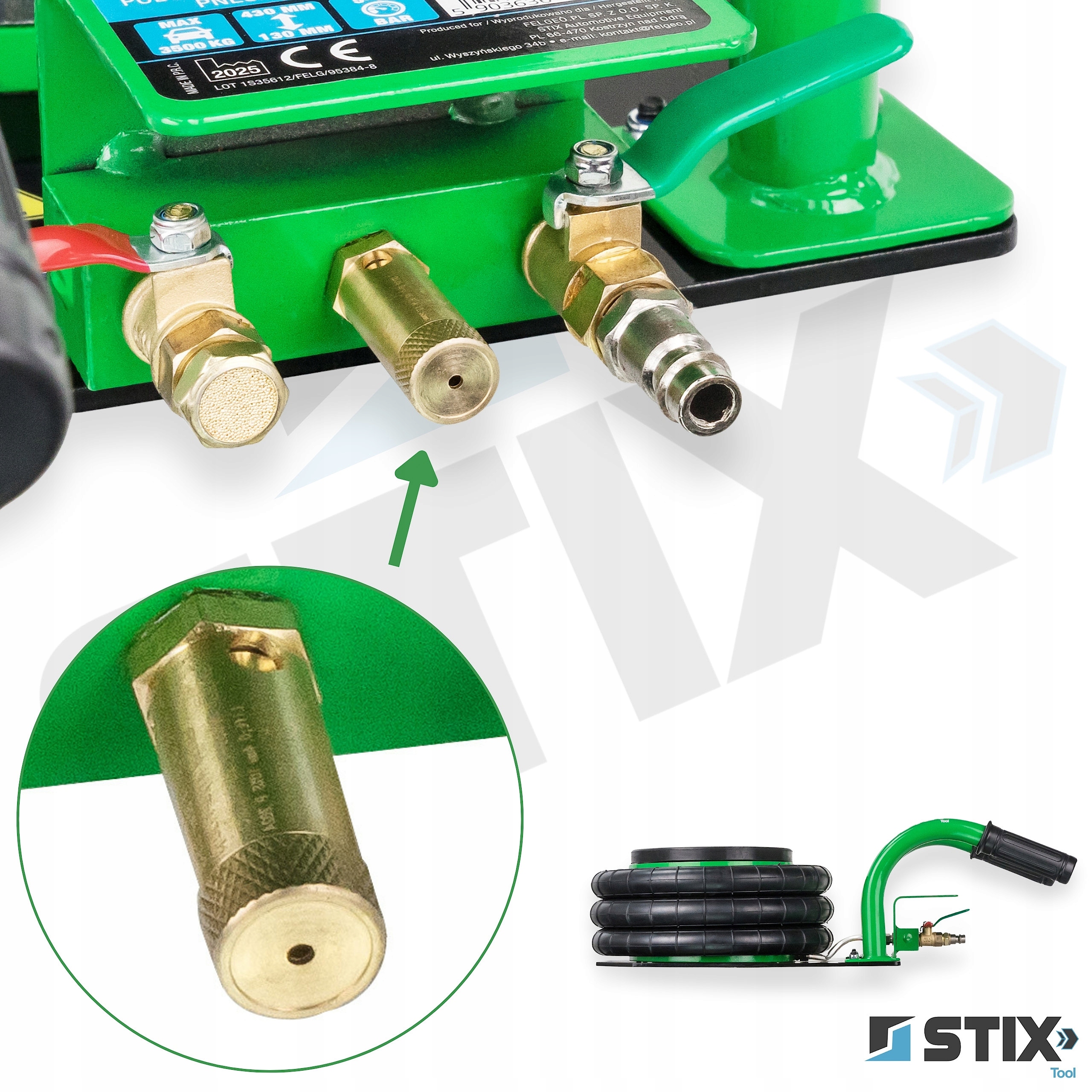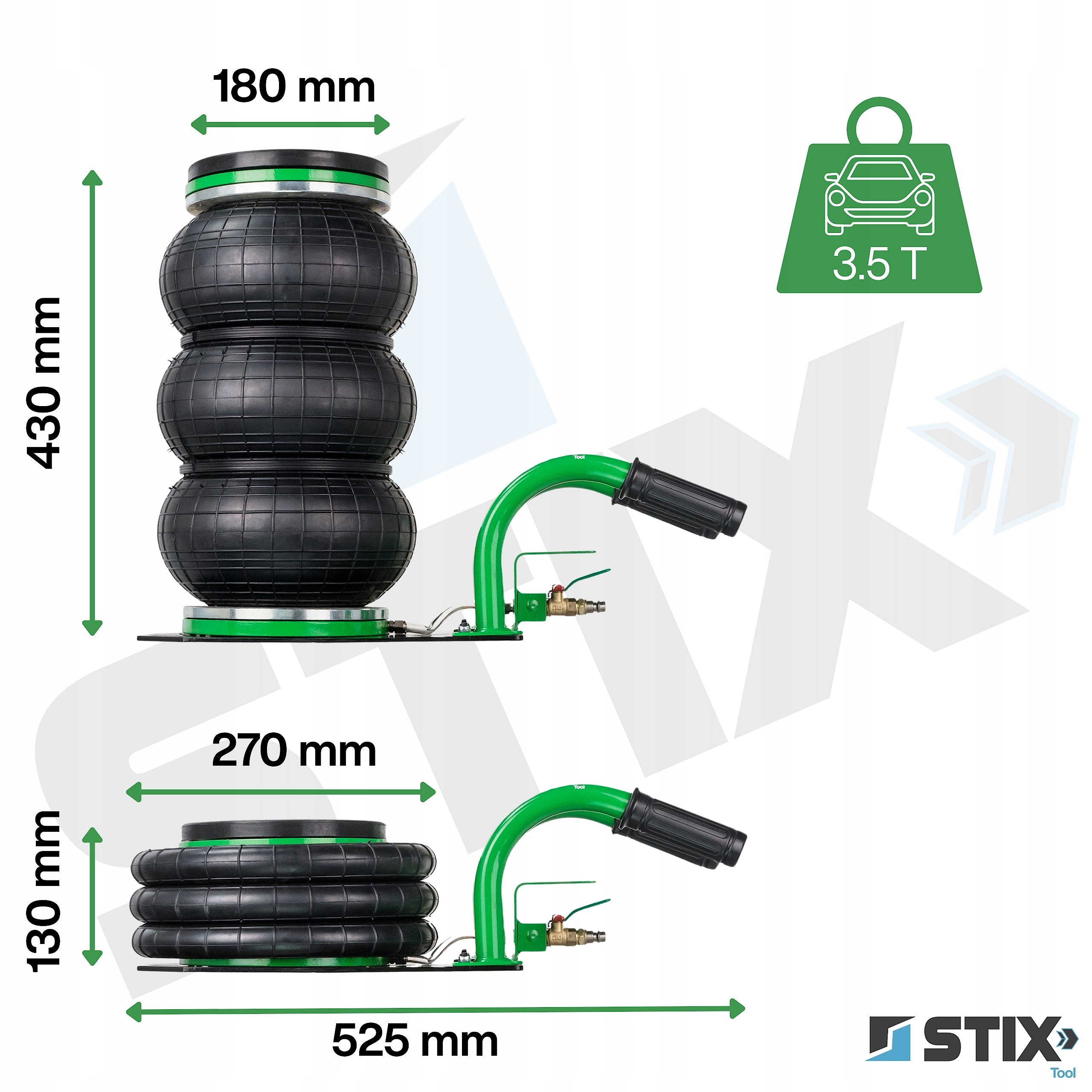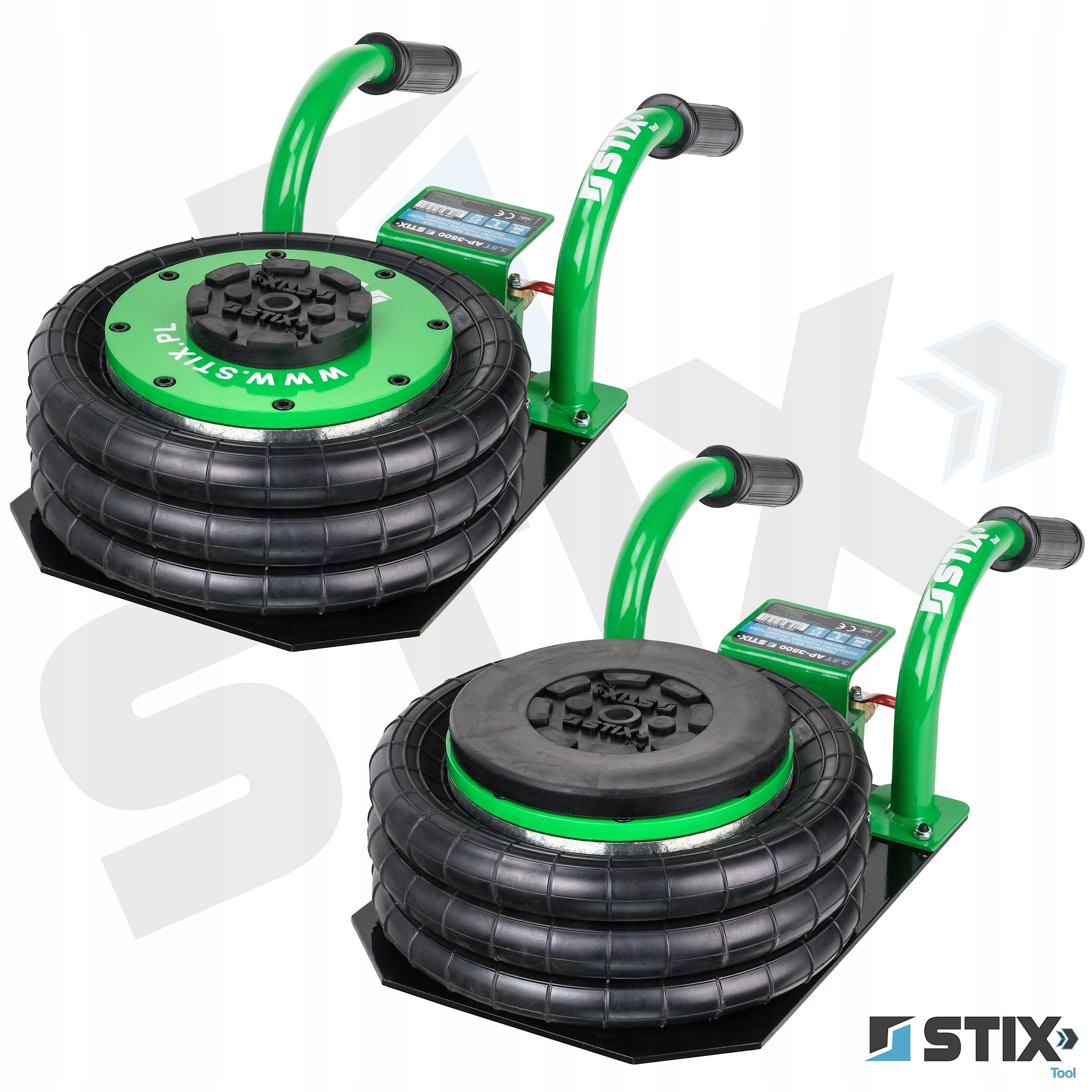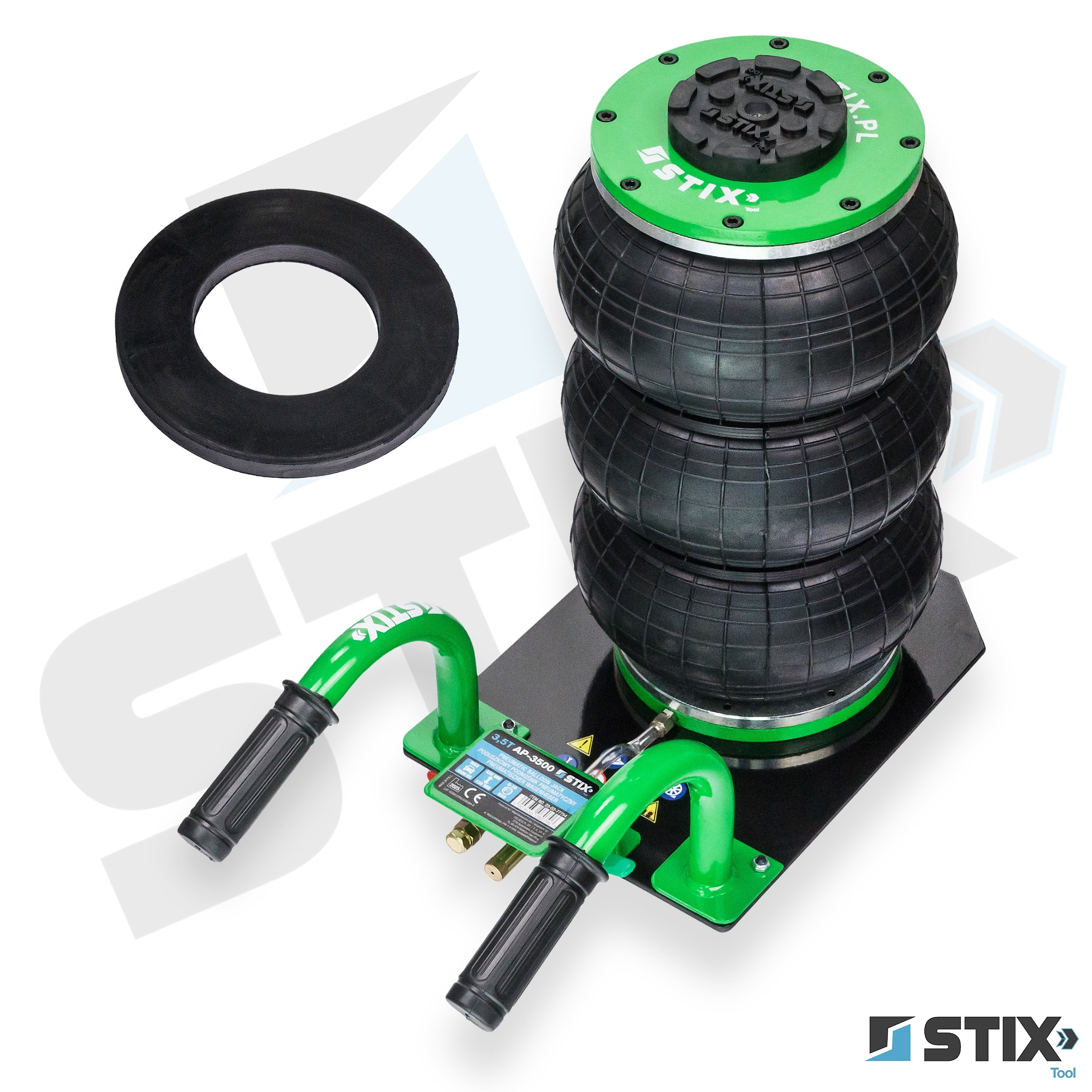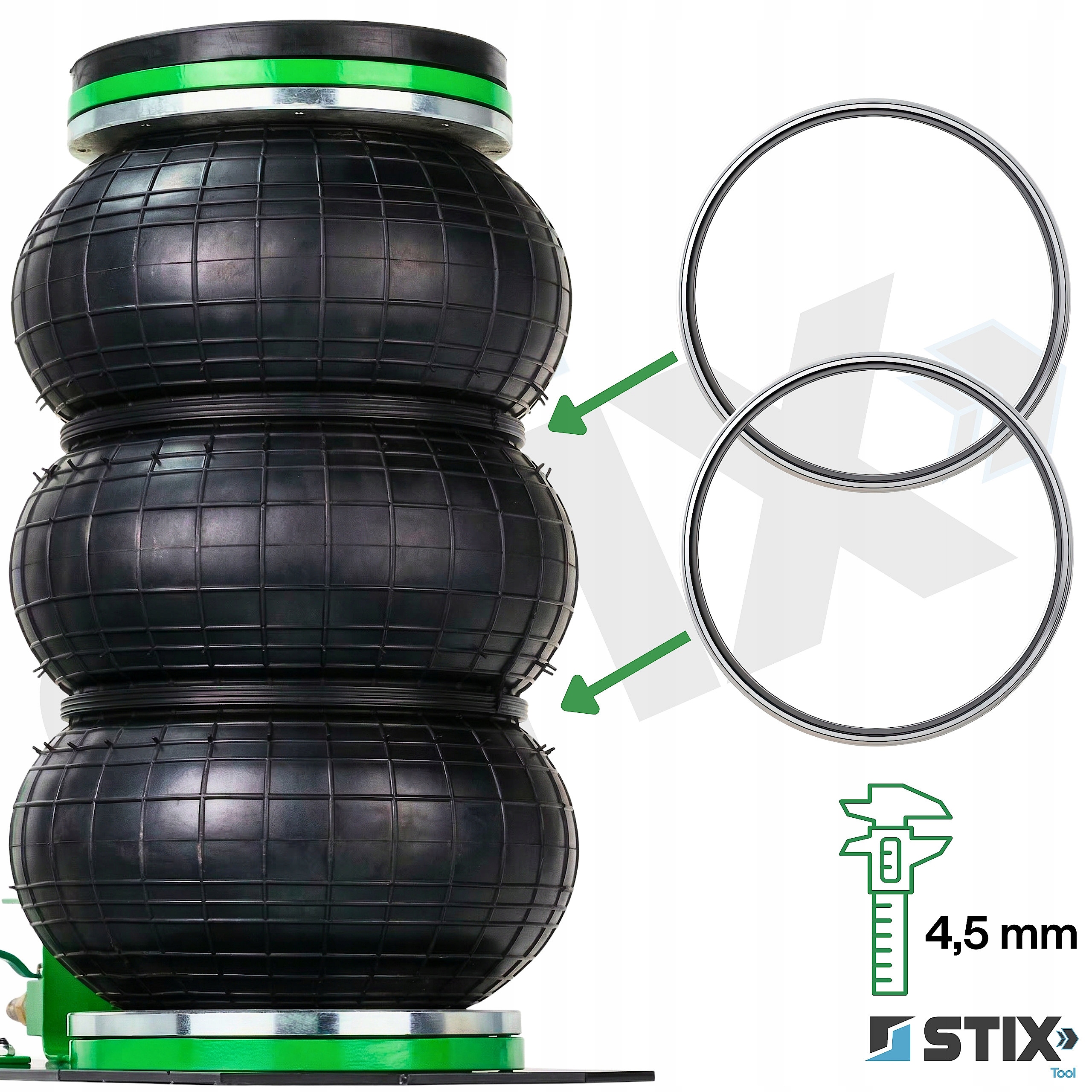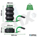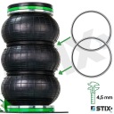 Podnośnik wykorzystuje 3-poziomowe miechy o średnicy 270 mm wykonane z wytrzymałej mieszanki gumowej.