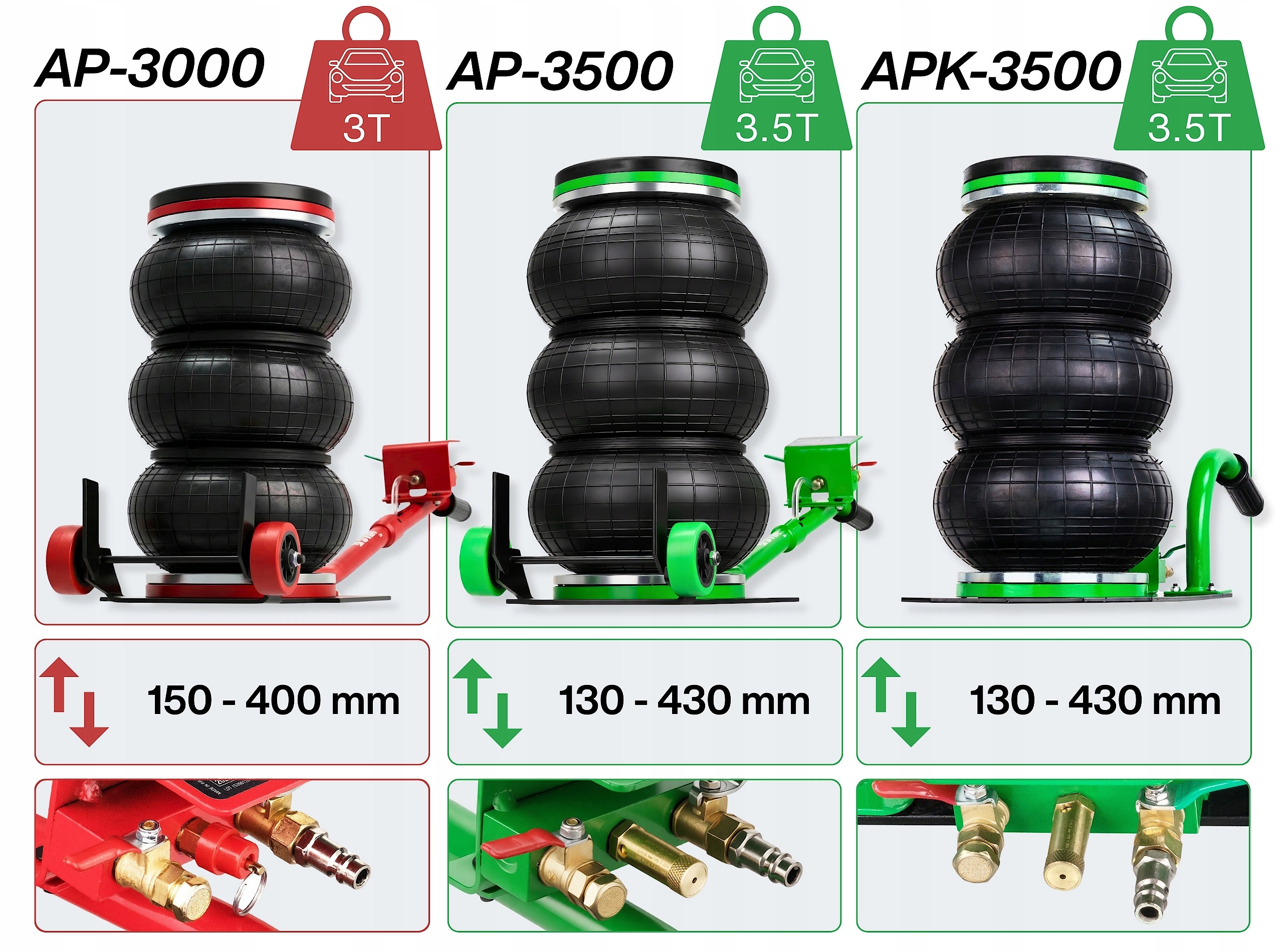 Seria podnośników pneumatycznych AP oraz APK opiera się na konstrukcjach o zróżnicowanej budowie i przeznaczeniu, dostosowanych do różnych warunków pracy warsztatowej.