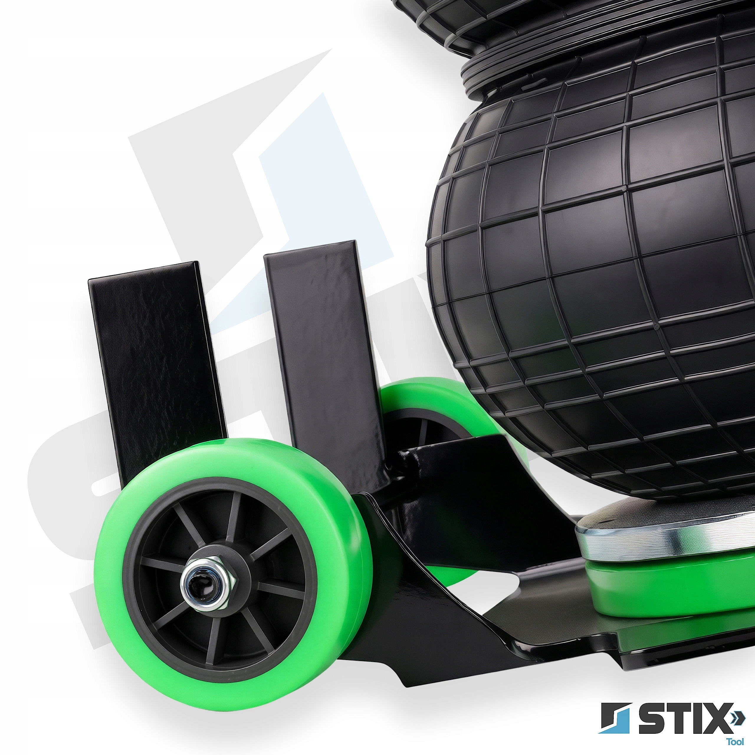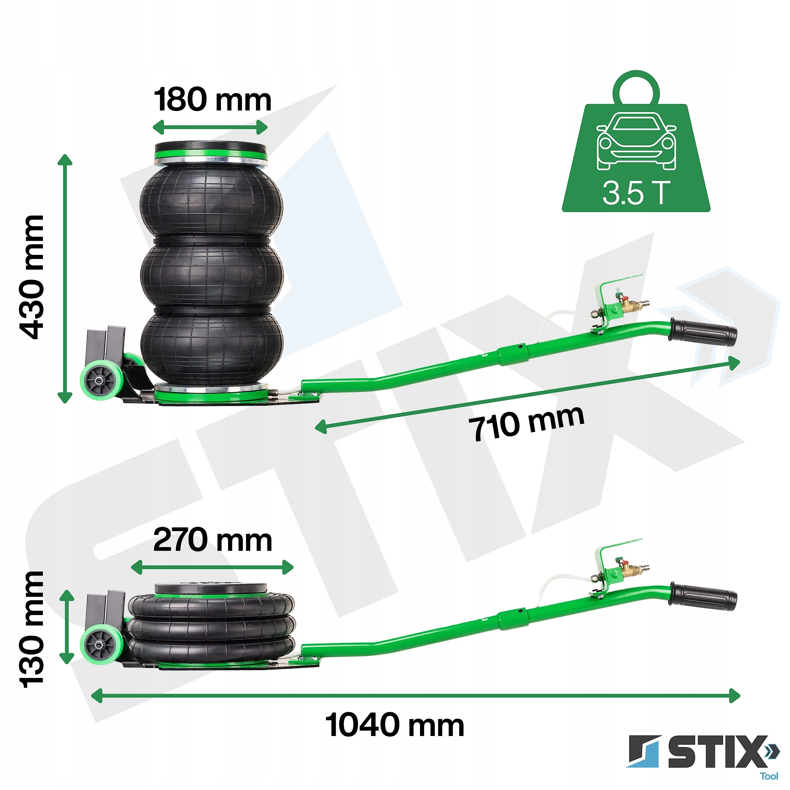 Pneumatyczny podnośnik bałwankowy AP-3500 przeznaczony jest do unoszenia pojazdów o masie do 3,5 tony. Konstrukcja oparta na 5-sekcyjnym teleskopie oraz wzmocnionych miechach zapewnia stabilną i płynną pracę w warunkach warsztatowych. Zakres pracy od 130 do 430 mm pozwala na zastosowanie zarówno przy standardowych, jak i obniżonych pojazdach.