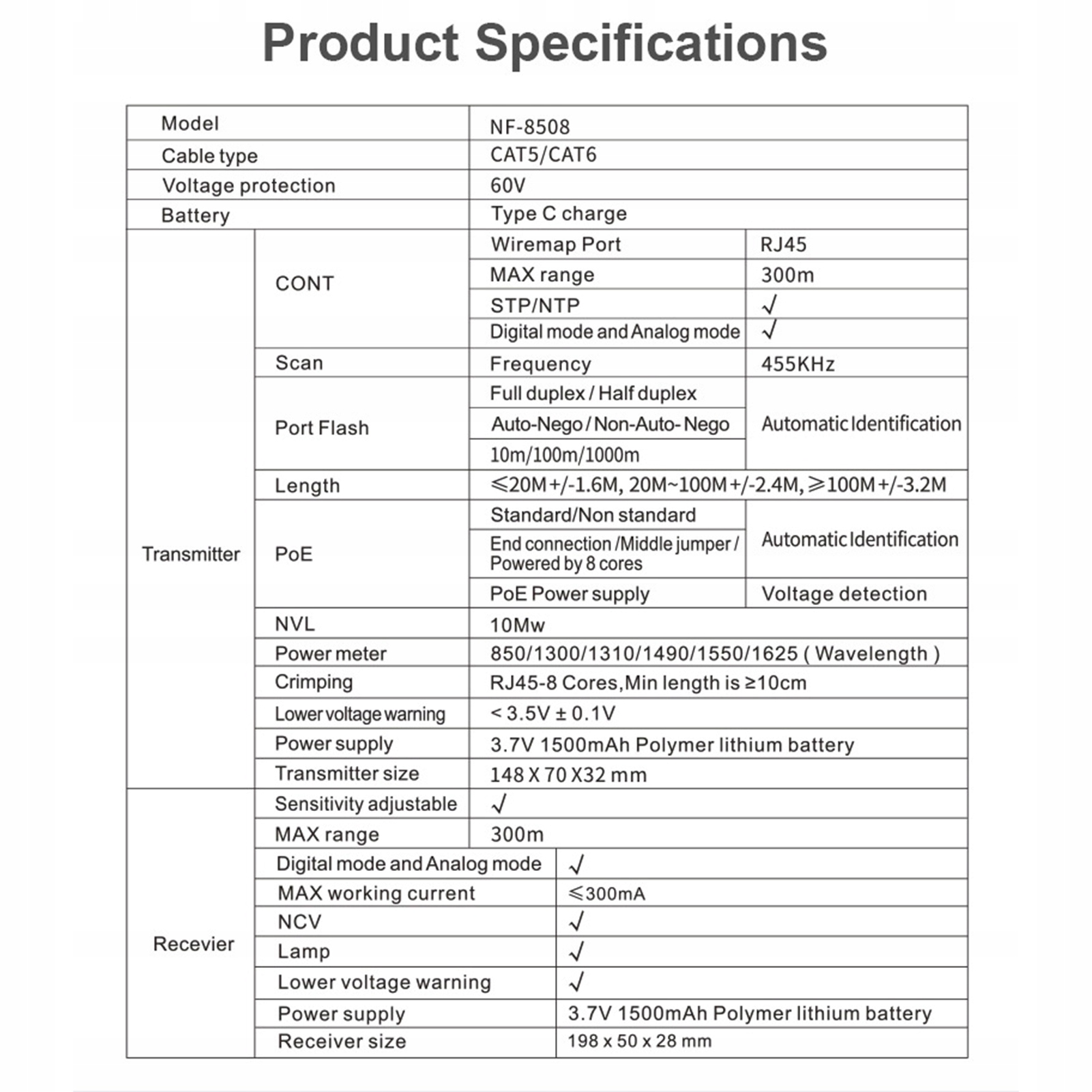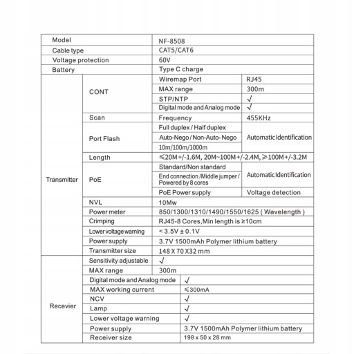 Funkcja odbiornika: regulacja czułości, 300m ekranowany kabel sieciowy bez obciążenia/nie pusty ekranowany kabel sieciowy, wykrywanie NCV, funkcja oświetlenia itp.