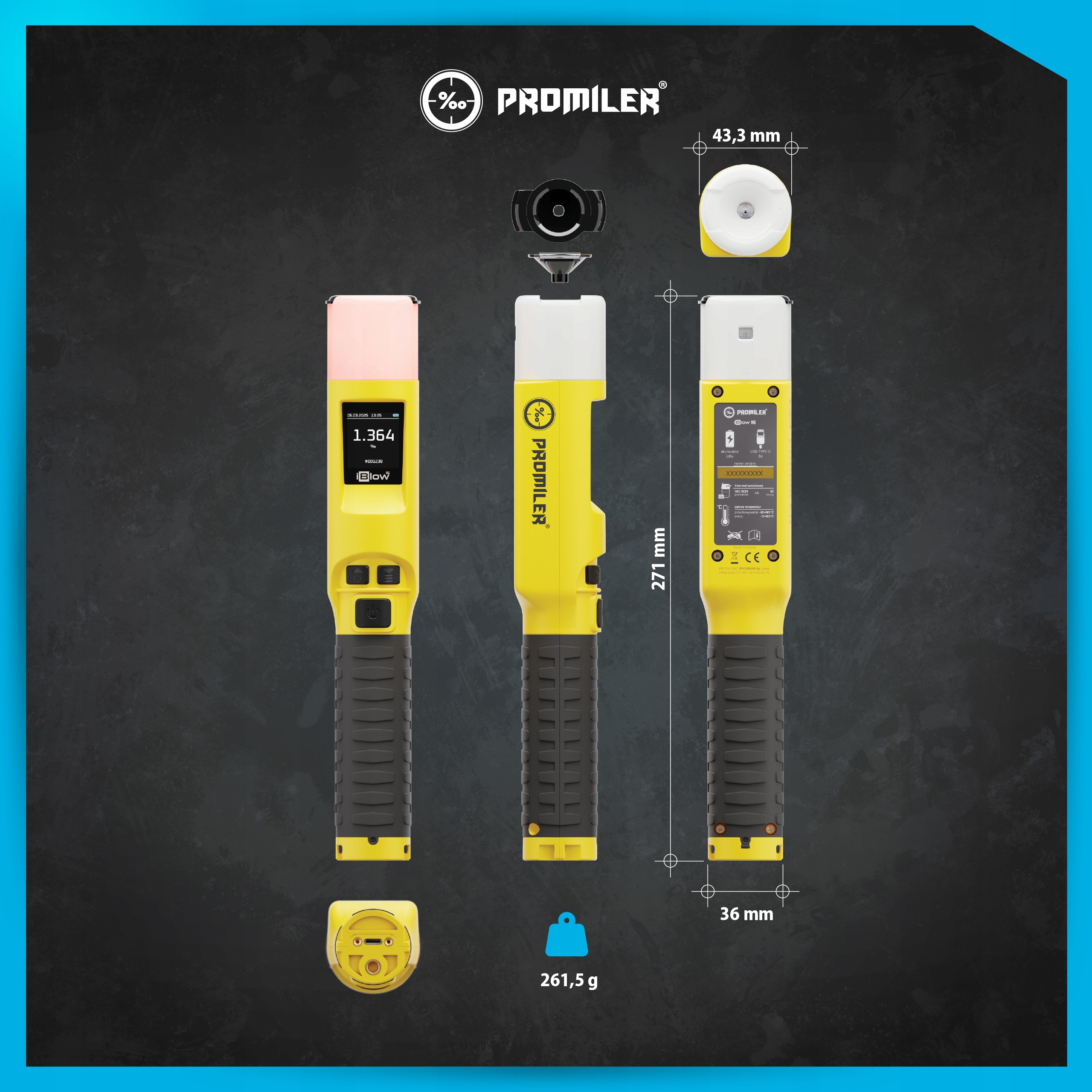 to najnowszy alkomat specjalistyczny w ofercie marki PROMILER, stworzony, by sprostać wymaganiom instytucji, służb mundurowych oraz firm stawiających na najwyższą jakość. Zaawansowana technologia pozwala na pomiar bezustnikowy, ułatwiając badanie wielu osób przy zachowaniu higieny i efektywności. Solidna obudowa, intuicyjne menu oraz wydajne zasilanie gwarantują komfort użytkowania w każdych warunkach.