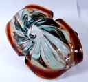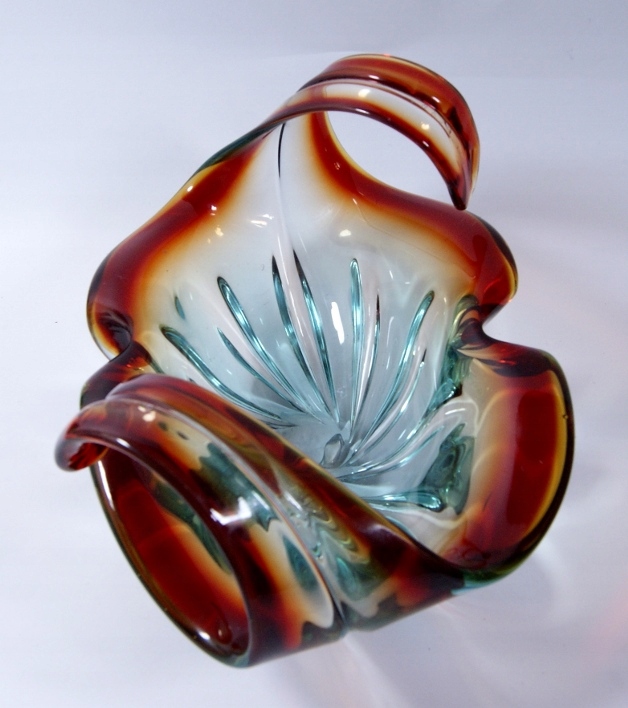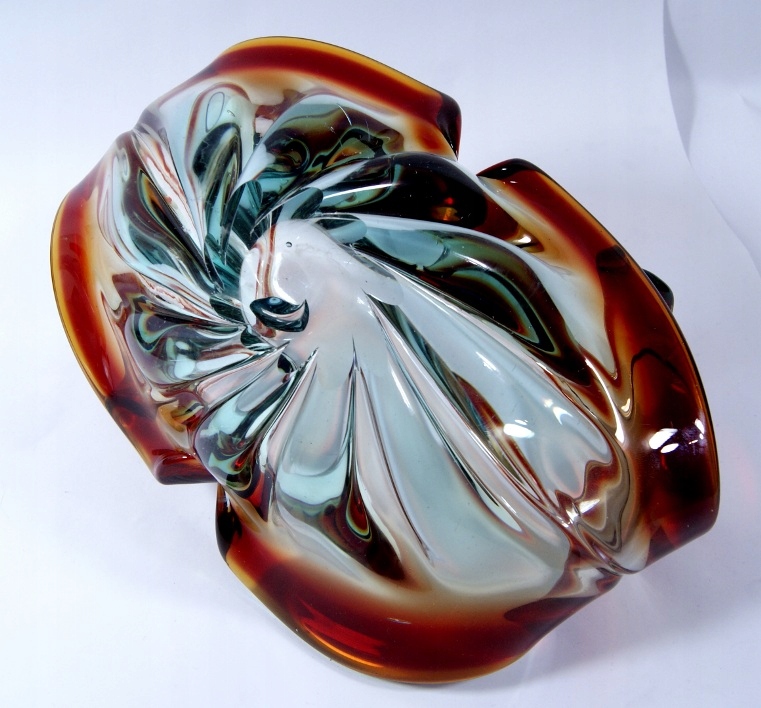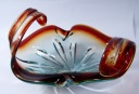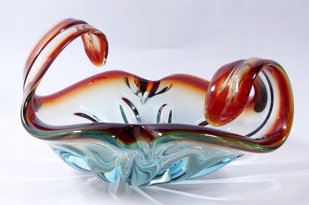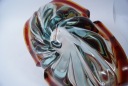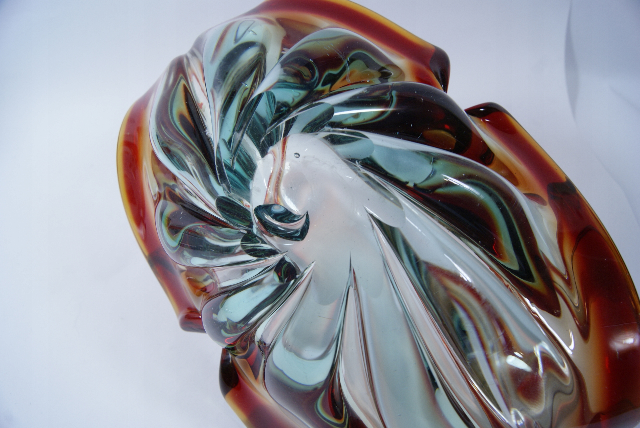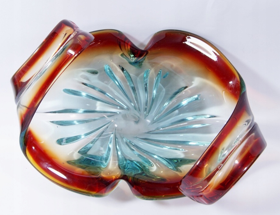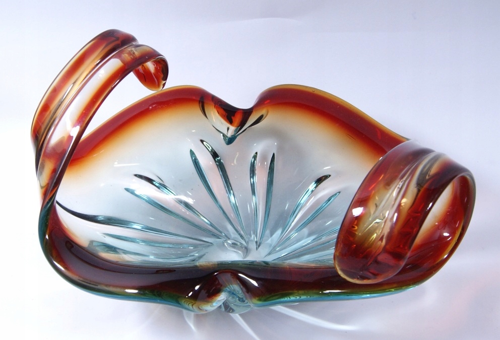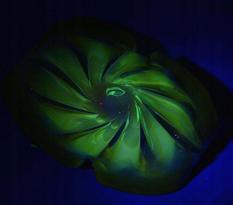 Przedmiotem aukcji jest śliczna, stara patera dekoracyjna, ręcznie wykonana z grubego, kolorowego szkła. Szkło uranowe, świeci na zielono w promienach lampy uv.