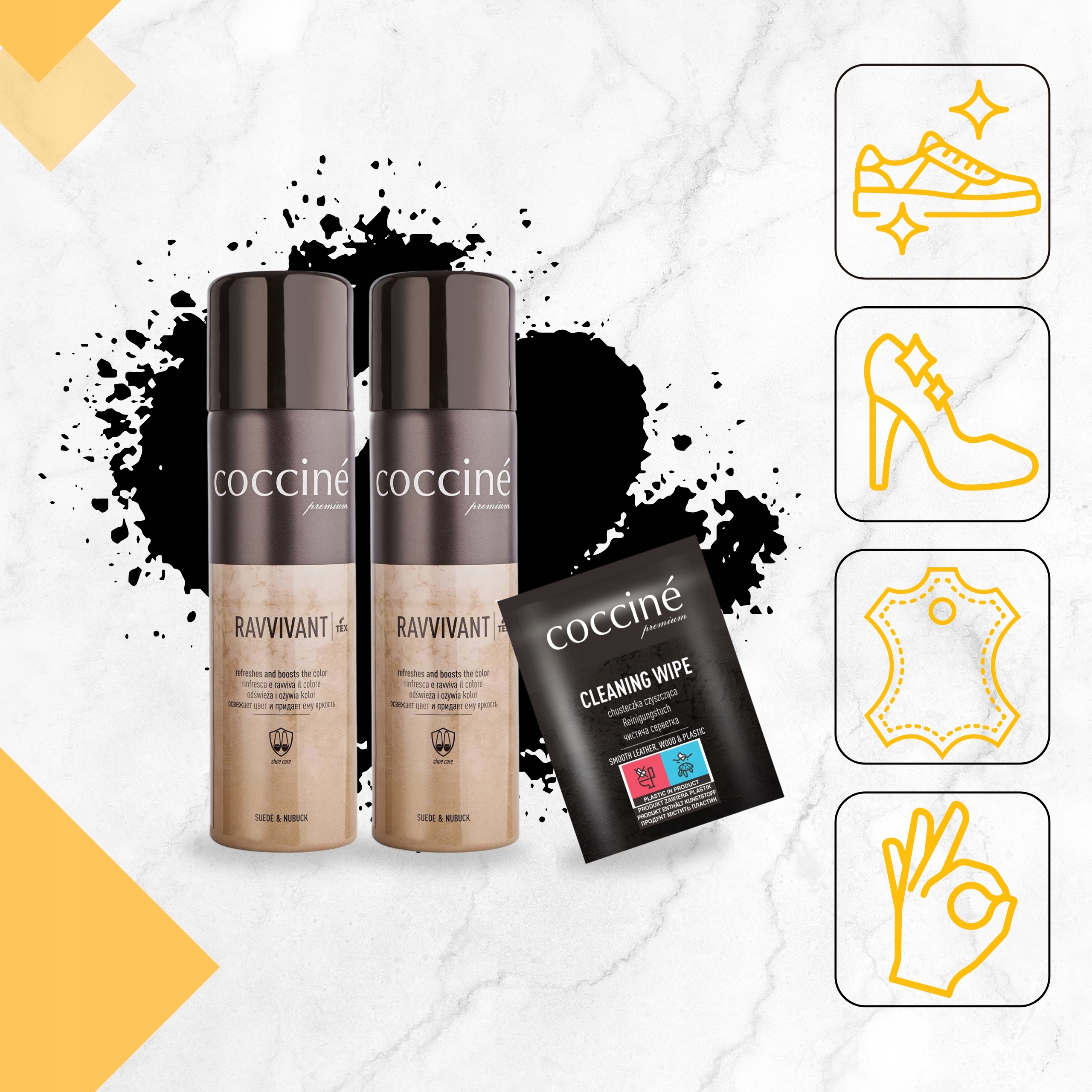 Coccine Ravvivant w sprayu to niezawodny sposób na odnowienie koloru i wyglądu obuwia oraz akcesoriów z nubuku i zamszu. Farba w sprayu o wysokiej jakości, skutecznie łączy funkcję koloryzującą, pielęgnacyjną i ochronną. Wybierz sprawdzony produkt renomowanej marki i przywróć swoim butom dawny blask!