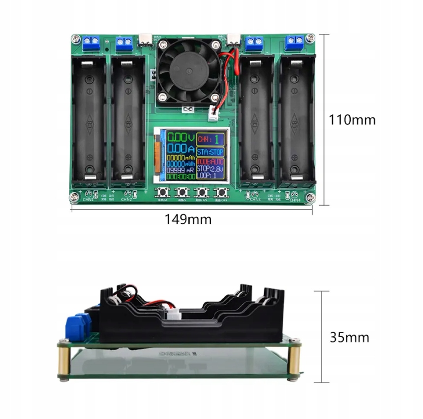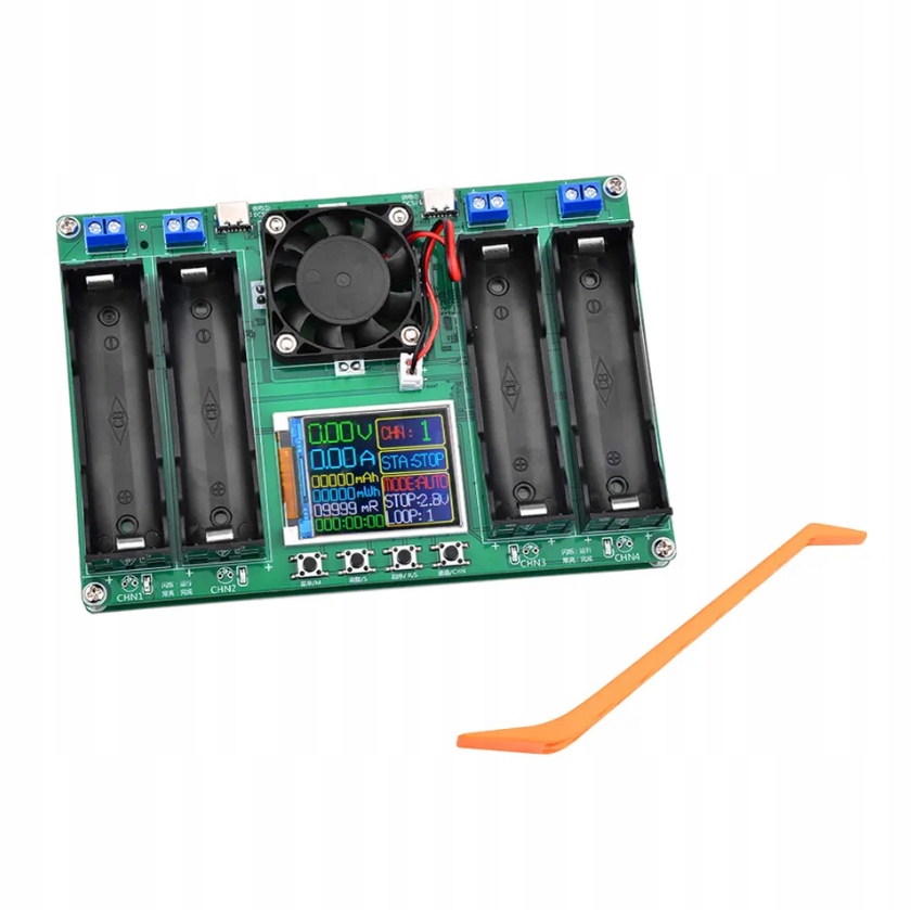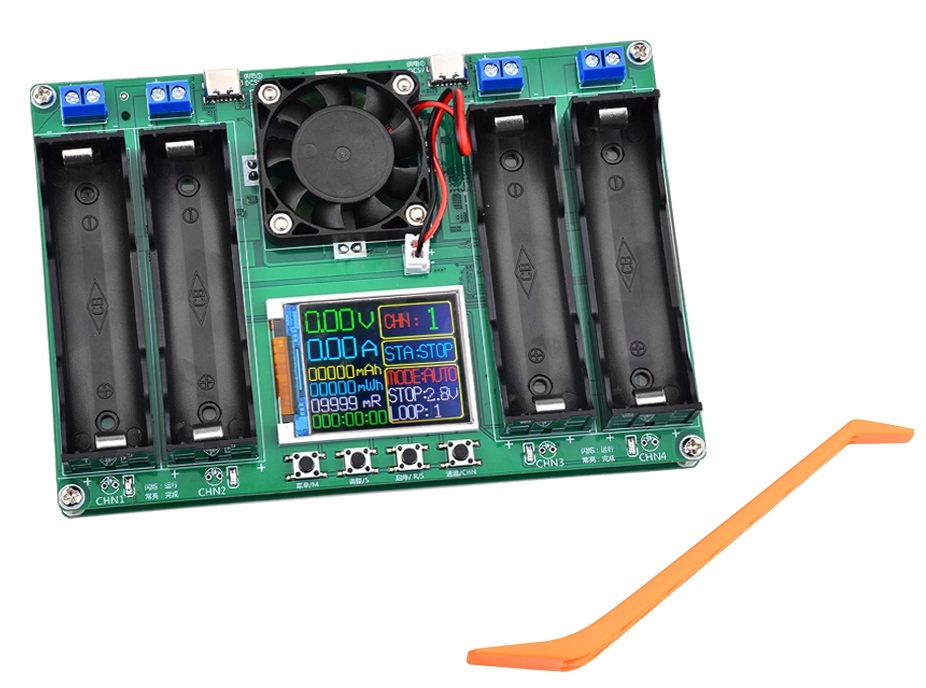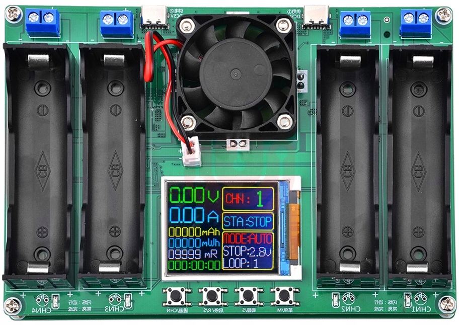Tester ogniw Li-ion 18650 wersja 4 kanałowa Tester pojemności pozwala na wykonie pomiaru pojemności 4 akumulatorów Li-ion 18650. Dodatkowo urządzenie posiada możliwości wyświetlania wartości w mWh, pomiar rezystancjo wewnętrznej i wiele innych. Zasilanie układu z portów USB C. Prąd rozładowywania to 950mA . Moduł posiada diody LED informujące o wyświetlanej jednostce, oraz uruchomionym trybie testowania. Bardzo prosta obsługa, wystarczy podłączyć zasilanie, umieścić badane ogniwo, ustawić dolną granicę napięcia i uruchomić test. Po zakończeniu procesu na wyświetlaczu otrzymujemy gotowy wynik co sygnalizuje mruganie wyświetlacza. W celu zmiany języka na angielski : Wyłącz zasilanie Naciśnij i trzymaj przycisk menu( 1 z lewej strony) Włącz zasilanie (Wciąż trzymamy przycisk menu) Po ok 3 sekundach puść przycisk menu Gotowe