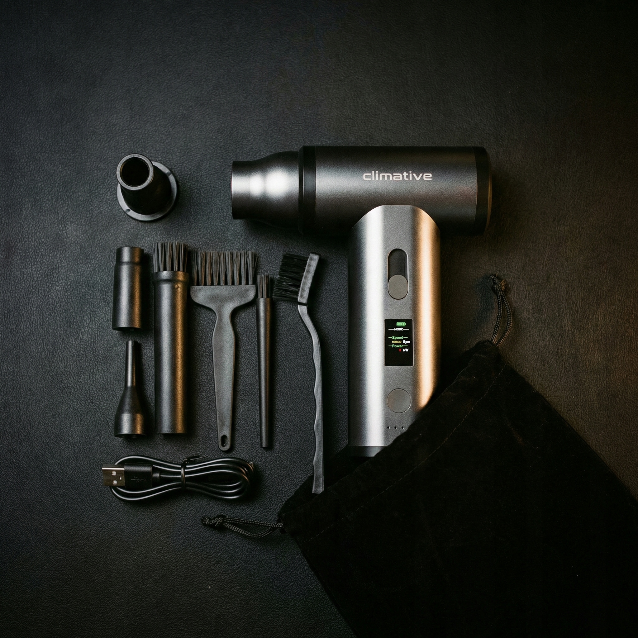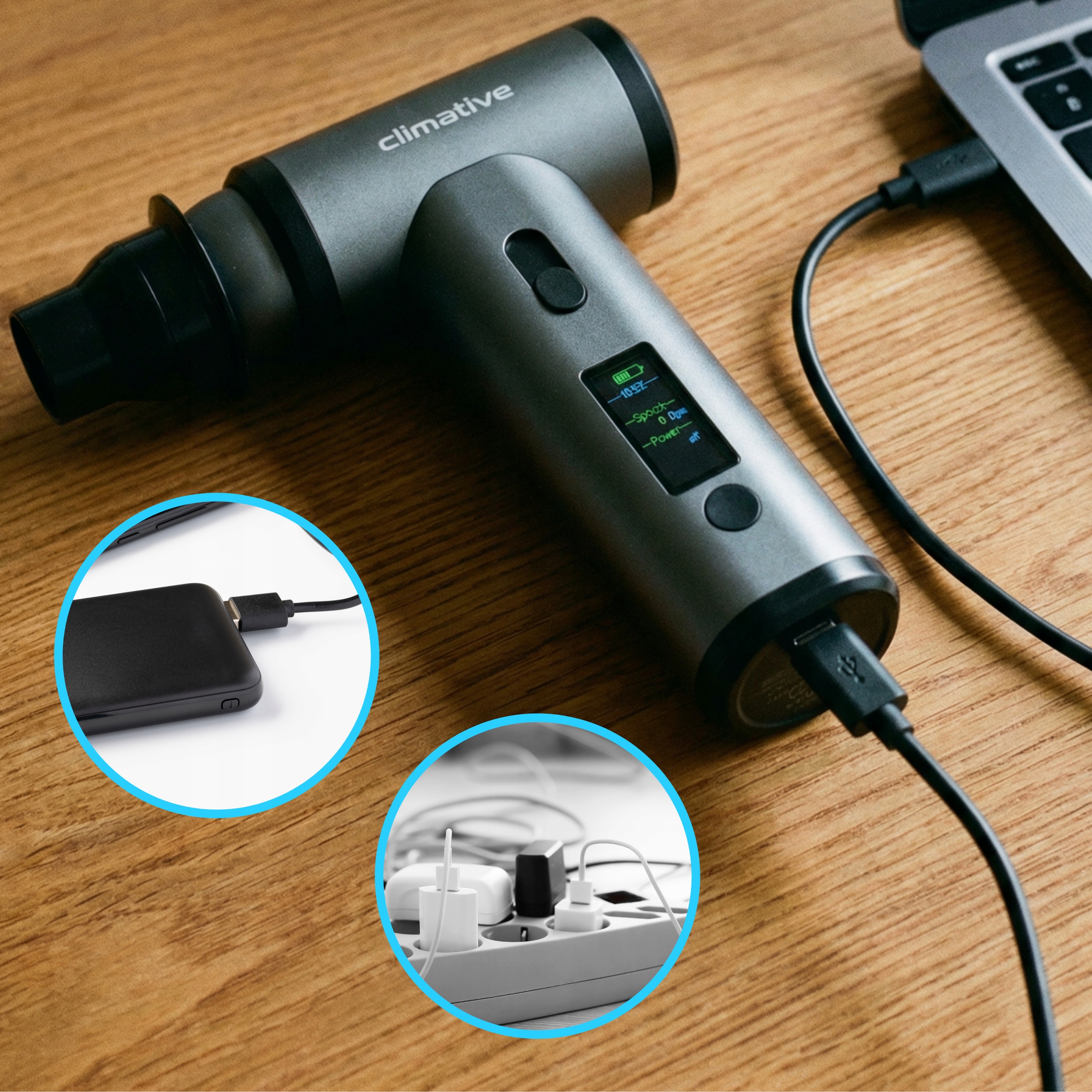 Dzięki dołączonym akcesoriom, Climative JF03 staje się wielofunkcyjnym narzędziem, które zastępuje tradycyjne sprężone powietrze oraz pompki elektryczne.